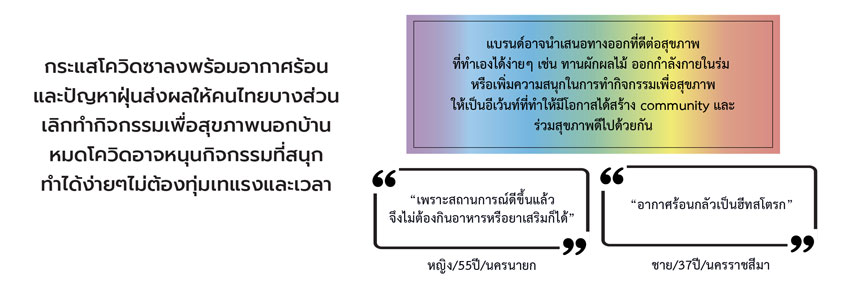 เนื่องจากสถานการณ์โควิดมีแนวโน้มที่ดีขึ้น ทำให้คนไทยหลายคนเริ่มละเลยเรื่องการใส่ใจสุขภาพของตนเอง คนไทยบางส่วนเลิกทำกิจกรรมเพื่อสุขภาพนอกบ้าน เช่น การเดิน วิ่ง จ๊อกกิ๊ง ยังรวมไปถึงการเลิกทานวิตามินซีหรือเลิกทานผลิตภัณฑ์เสริมเพื่อสุขภาพ ซึ่งอย่างไรก็ตามการดูแลสุขภาพของตนเองและครอบครัวยังคงเป็นสิ่งที่สำคัญ เนื่องจากปัญหาฝุ่นที่ยังคงอยู่ สภาพอากาศที่ร้อนจัดและเปลี่ยนแปลงตลอดเวลา อาจส่งกระทบต่อสุขภาพของคนไทยได้ แบรนด์ควรแนะหรือนำเสนอทางออกที่ดีต่อสุขภาพที่สามารถทำเองได้ง่ายๆ ที่บ้าน เช่น การทานผักและผลไม้ ทานอาหารให้ครบ 5 หมู่ รวมไปถึงการดื่มน้ำให้เพียงพอในหนึ่งวัน เพียงเท่านี้ก็จะสามารถสร้างเสริมให้คนไทยมีสุขภาพที่ดีไปด้วยกัน