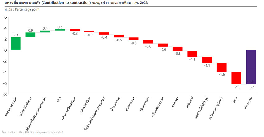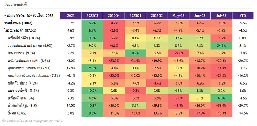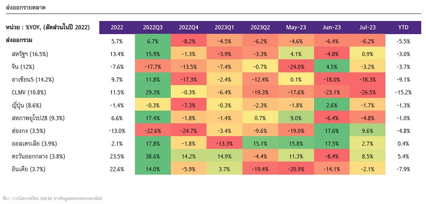 อย่างไรก็ตาม ท่ามกลางความเสี่ยงด้านต่ำจากเศรษฐกิจโลกและเศรษฐกิจจีนที่มีอยู่สูง SCB EIC ยังมองการส่งออกของไทยในช่วงท้ายปีจะสามารถกลับมาขยายตัวได้จากปัจจัยฐานต่ำ โดยเฉพาะในช่วงปลายปี เพราะมูลค่าการส่งออกสินค้าของไทยในไตรมาสสุดท้ายของปี 2022 เฉลี่ยอยู่ที่ 22,000 ล้านดอลลาร์สหรัฐต่อเดือน ซึ่งต่ำกว่าค่าเฉลี่ย 7 เดือนแรกของปีนี้ รวมถึงราคาสินค้าโภคภัณฑ์มีแนวโน้มสูงขึ้น เช่น ข้าว จากนโยบายระงับการส่งออกข้าวของอินเดียและปัญหาสภาพอากาศที่คาดว่าจะส่งผลให้ราคาส่งออกข้าวของโลกปรับสูงขึ้นในระยะข้างหน้า ทั้งนี้ SCB EIC อยู่ระหว่างการประเมินสถานการณ์ส่งออกอย่างใกล้ชิดและจะเผยแพร่การประมาณการใหม่ในเดือน ก.ย. นี้