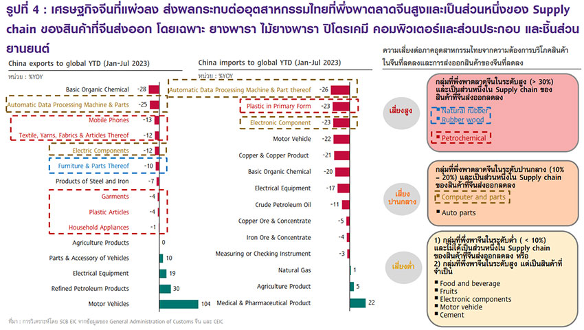 การส่งออกสินค้าไทยในระยะต่อไปยังน่าห่วงและอาจแย่กว่าคาดจากเศรษฐกิจจีนที่แผ่วลง แม้ SCB EIC มองการขยายตัวเศรษฐกิจโลกในปี 2023 มีแนวโน้มเติบโตดีขึ้นที่ 2.4% (เดิม 2.1%) ตามเศรษฐกิจสหรัฐฯ และเศรษฐกิจญี่ปุ่นที่มีแนวโน้มดีกว่าคาด แต่ยังเป็นการขยายตัวในระดับต่ำเทียบกับปีก่อน อีกทั้ง เศรษฐกิจโลกในช่วงครึ่งหลังของปียังมีแนวโน้มเติบโตชะลอลงกว่าในช่วงครึ่งแรกของปี รวมถึงเศรษฐกิจจีนที่ฟื้นตัวช้าจะเป็นความเสี่ยงด้านต่ำสำคัญของการส่งออกไทยในระยะต่อไป โดยดัชนี Flash Manufacturing PMI ในเดือน ส.ค. ของประเทศคู่ค้าสำคัญหดตัวต่อเนื่อง นำโดย Eurozone Manufacturing PMI ที่ยังอยู่ในระดับต่ำที่ 43.7 UK Manufacturing PMI ลดลงมาอยู่ที่ 42.5 (45.3 ในเดือน ก.ค.) ขณะที่ US Manufacturing PMI หดตัวรุนแรงขึ้นที่ระดับ 47.0 (49.0 ในเดือน ก.ค.) ในขณะที่เศรษฐกิจจีนเติบโตชะลอตัวต่อเนื่อง สะท้อนจากดัชนีผู้จัดการฝ่ายจัดซื้อ (PMI) ที่ปรับตัวลดลงทั้งภาคการผลิตและบริการ ท่ามกลางความเสี่ยงใหม่จากการผิดนัดชำระเงินของบริษัทอสังหาฯ และบริษัทการเงินขนาดใหญ่กระทบความเชื่อมั่นของนักลงทุน และคาดว่าจะกดดันการฟื้นตัวของส่งออกไทยในหลายกลุ่มสินค้า โดยเฉพาะอุตสาหกรรมไทยที่พึ่งพาตลาดจีนสูงและเป็นส่วนหนึ่งของห่วงโซ่อุปทานของสินค้าที่จีนส่งออก เช่น ยางพารา ไม้ยางพารา ปิโตรเคมี คอมพิวเตอร์และส่วนประกอบ และชิ้นส่วนยานยนต์ (รูปที่ 4)