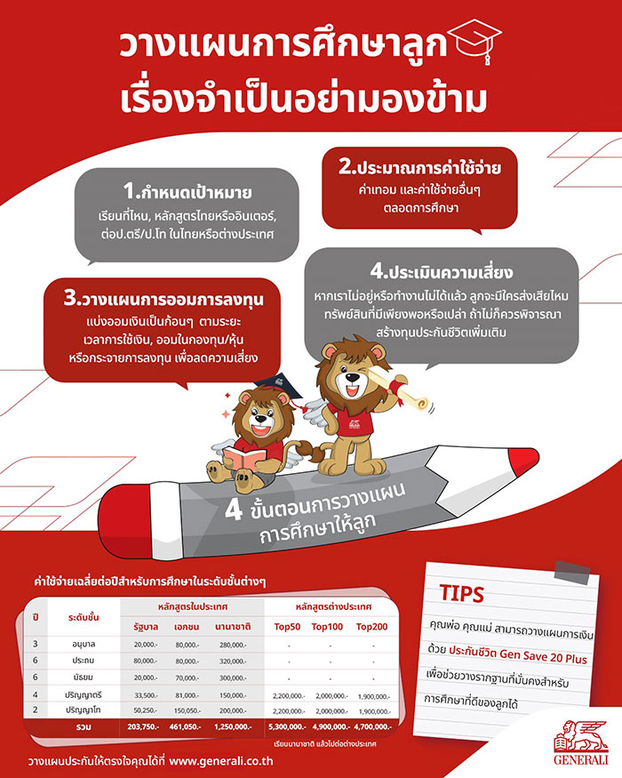 เทคนิคดังกล่าวข้างต้นนอกจากจะช่วยวางแผนด้านการศึกษาให้ลูกน้อยได้แล้ว ยังสามารถนำไปปรับใช้ในการวางแผนการออมเพื่อสร้างอนาคตที่มั่นคงได้อีกด้วยเช่นกัน สำหรับใครที่ต้องการข้อมูลด้านการออมและการลงทุนผ่านประกันชีวิตสามารถเข้าไปดูรายละเอียดต่าง ๆ ได้ที่ Gen Healthy Life