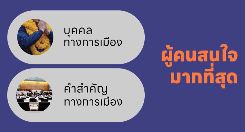 - การเมือง การเลือกตั้งในปีที่ผ่านมาถือเป็นวาระสำคัญของประเทศที่ทำให้เรื่องการเมืองอยู่ในความสนใจของคนทุกช่วงวัย ตามด้วยเหตุการณ์สำคัญที่เกี่ยวข้องเกิดขึ้นต่อเนื่องมาจนถึงปัจจุบัน เรียกได้ว่าร้อนระอุแบบไม่แผ่ว ส่งให้คอนเทนต์การเมืองถูกอ่านรวมกว่า 514 ล้านวิว นอกจากนั้น ยอดวิวการเข้าชมไลฟ์นับผลคะแนนเลือกตั้งยังพุ่งสูงเป็นประวัติการณ์กว่า4 ล้านวิว โดยบุคคลและคำสำคัญที่ถูกคลิกอ่านมากที่สุด ได้แก่ “ก้าวไกล - พิธา – ทักษิณกลับไทย - ดิจิทัลวอลเล็ต และ สมรสเท่าเทียม”