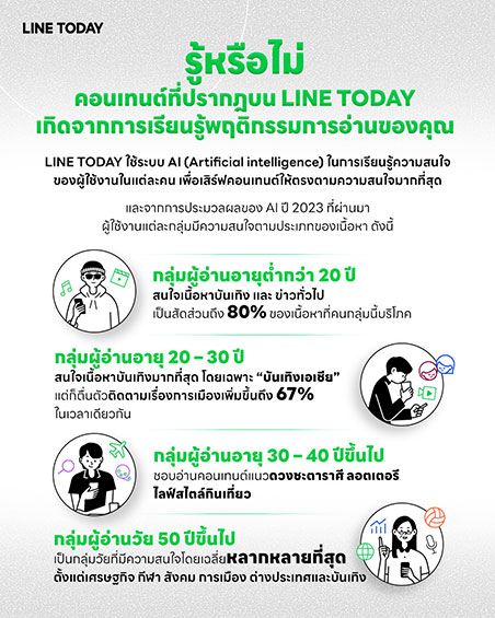 LINE TODAY เปิดอินไซต์พฤติกรรมบริโภคคอนเทนต์ - ข่าวสารของคนไทยบนแพลตฟอร์มในรอบปีที่ผ่านมา พบ “การเมือง – ดวง – บันเทิง” ครองหมวดเนื้อหามาแรงที่สุด พร้อมเผยความชอบตามช่วงวัย พบผู้อ่านวัยต่ำกว่า 30 ปีสนใจชอบ “บันเทิงเอเชีย” ขณะที่ก็ตื่นตัวเรื่องการเมืองไม่แพ้กัน