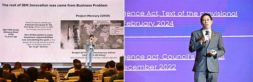 จากนั้น ผศ.ดร.ณัฐพล ยังได้บรรยายพิเศษในหัวข้อ ทิศทางการขับเคลื่อนเศรษฐกิจดิจิทัลด้วยนวัตกรรมปัญญาประดิษฐ์ โดยกล่าวว่า ปัจจุบันเทคโนโลยีและนวัตกรรมถือเป็นกลไกสำคัญในการขับเคลื่อนระบบเศรษฐกิจและสังคมทำให้เกิดธุรกิจรูปแบบใหม่ อีกทั้งเปลี่ยนแปลงพฤติกรรมผู้บริโภคไปจากเดิม โดยเฉพาะอย่างยิ่งเทคโนโลยีปัญญาประดิษฐ์ (AI) ดังนั้นรัฐบาลต้องขับเคลื่อนองค์ประกอบสำคัญในการเตรียมความพร้อมด้านการพัฒนาเอไอ ประกอบด้วย AI Importer การเตรียมพร้อมรองรับการพัฒนาเอไอจากนอกประเทศ AI Provider การส่งเสริมการพัฒนาเอไอภายในประเทศ AI Distributor การประยุกต์ใช้เอไอเพื่อพัฒนาบริการดิจิทัล AI Manpower การเตรียมพร้อมกำลังคนดิจิทัลสาขาเอไอ และ AI User การสร้างความตระหนักรู้ด้านการใช้เอไออย่างปลอดภัยแก่คนไทย นอกจากนี้ AI ยังส่งผลกระทบและสร้างความท้าทายต่อการคุ้มครองและส่งเสริมการใช้ประโยชน์จากทรัพย์สินทางปัญญาประเภทต่าง ๆ เช่น ลิขสิทธิ์ สิทธิบัตร เครื่องหมายการค้า ความลับทางการค้า ฯลฯ ซึ่ง กระทรวงดิจิทัลเพื่อเศรษฐกิจและสังคม โดย ดีป้า เล็งเห็นความสำคัญและดำเนินการส่งเสริมการจัดทำหรือยื่นจดทะเบียนทรัพย์สินทางปัญญาด้านดิจิทัลมาอย่างต่อเนื่อง ขณะเดียวกันยังมีการให้ความรู้ด้านเทคโนโลยี AI ซึ่ง ดีป้า หวังเป็นอย่างยิ่งว่า การดำเนินงานต่าง ๆ จะช่วยรักษาและปกป้องทรัพย์สินทางปัญญา ขับเคลื่อนเศรษฐกิจและสังคมในยุคดิจิทัล เพิ่มขีดความสามารถทางการแข่งขันแก่ผู้ประกอบการไทยเพื่อก้าวสู่ระดับสากล