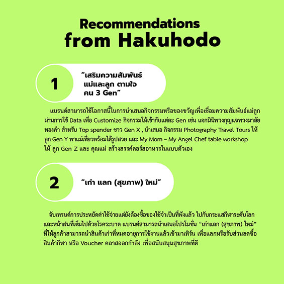 ถือเป็นโอกาสที่ดีที่แบรนด์จะใช้โอกาสในวันแม่นี้นำเสนอกิจกรรมหรือขอขวัญเพื่อเชื่อมความสัมพันธ์แม่ลูก ผ่านการใช้ Data เพื่อ Customize กิจกรรมให้เข้ากัยแต่ละ Gen เช่น การแจกมินิพวงกุญแจมาลัยทองคำสำหรับ Top spender ชาว Gen X, นำเสนอ กิจกรรม Photography Travel Tours ให้ลูก Gen Y พาแม่เที่ยวพร้อมได้รูปสวย และ My Mom – My Angel Chef table workshop ให้ ลูก Gen Z และคุณแม่ สร้างสรรค์คอร์สอาหารในแบบของตัวเอง