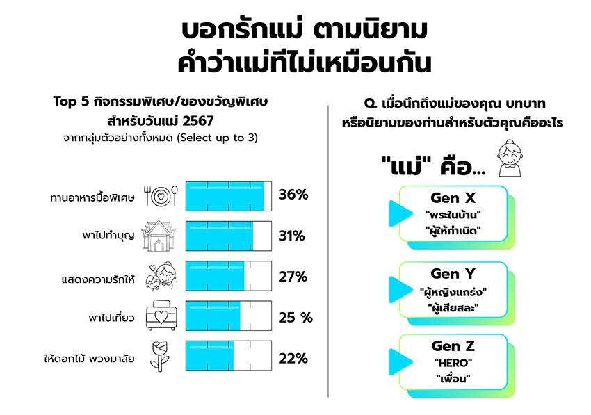 แม่ เป็น พระในบ้าน และ ผู้ให้กำเนิด คน Gen X มักตอบแทนด้วยการแสดงออกถึงความรักแม่ตามขนบธรรมเนียมไทย เช่น การให้พวงมาลัย ถือเป็น Gen ที่เลือกโหวตการมอบพวงมาลัยให้แม่มากที่สุดใน 3 Gen