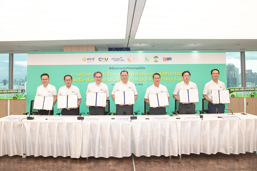 ดร.รักษ์ วรกิจโภคาทร กรรมการผู้จัดการ ธนาคารเพื่อการส่งออกและนำเข้าแห่งประเทศไทย (EXIM BANK) ดร.จุฬา สุขมานพ เลขาธิการคณะกรรมการนโยบายเขตพัฒนาพิเศษภาคตะวันออก (EEC) ดร.กิติพงค์ พร้อมวงค์ ผู้อํานวยการ สํานักงานสภานโยบายการอุดมศึกษาวิทยาศาสตร์ วิจัยและนวัตกรรมแห่งชาติ ศาสตราจารย์ ดร.ชูกิจ ลิมปิจํานงค์ ผู้อํานวยการ สํานักงานพัฒนาวิทยาศาสตร์และเทคโนโลยีแห่งชาติ รองศาสตราจารย์ประเสริฐ ฤกษ์เกรียงไกร รองอธิการบดี มหาวิทยาลัยเชียงใหม่ นายวีระเดช เตชะไพบูลย์ นายกสมาคมพลังงานหมุนเวียนไทย และ ดร.สุวิทย์ ธรณินทร์พานิช ประธานกรรมการ มูลนิธิพลังงานสะอาดเพื่อประชาชน ร่วมลงนามในบันทึกความเข้าใจเรื่องการสนับสนุนการใช้รถยนต์ไฟฟ้าในระบบขนส่งสาธารณะและรถรับ-ส่งพนักงานในพื้นที่ EEC ณ สำนักงาน EEC เมื่อเร็วๆ นี้
