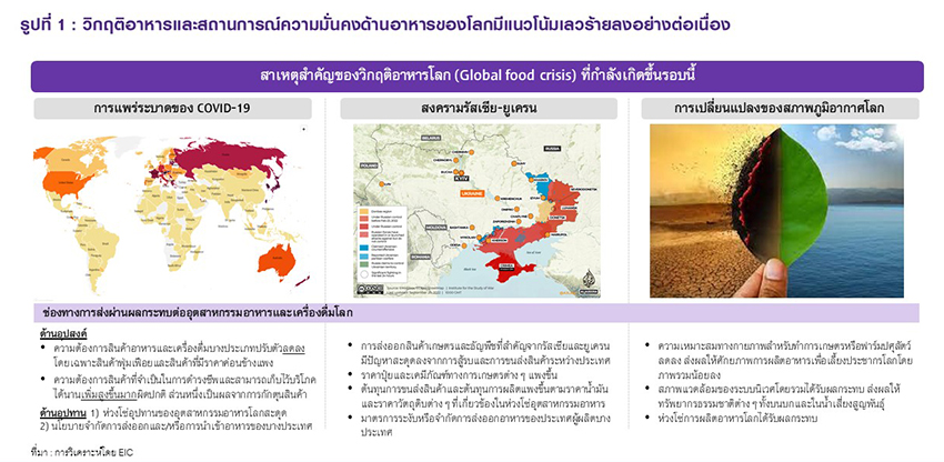 ปัจจุบันวิกฤติอาหารโลก (Global food crisis) มีแนวโน้มขยายวงกว้างและรุนแรงมากขึ้นเรื่อย ๆ ท่ามกลางความเสี่ยงด้านต่าง ๆ ในระบบนิเวศน์ที่เพิ่มสูงขึ้น ทั้งนี้จากการศึกษาพบว่าวิกฤติอาหารโลกที่เกิดขึ้นรอบนี้มีสาเหตุหลักมาจาก 3 ปัจจัย ได้แก่ 1) การแพร่ระบาดของ COVID-19 2) สงครามรัสเซีย-ยูเครน และ 3) การเปลี่ยนแปลงของสภาพภูมิอากาศโลก ซึ่งปัจจัยดังกล่าวเหล่านี้ได้ส่งผลให้เกิดการเปลี่ยนแปลงทั้งด้านอุปทานและอุปสงค์ในตลาดอาหารโลกในวงกว้างอย่างมีนัยสำคัญ อีกทั้งยังส่งผลกระทบต่อห่วงโซ่การผลิตอาหารโลกตั้งแต่ระดับต้นน้ำจนถึงปลายน้ำ