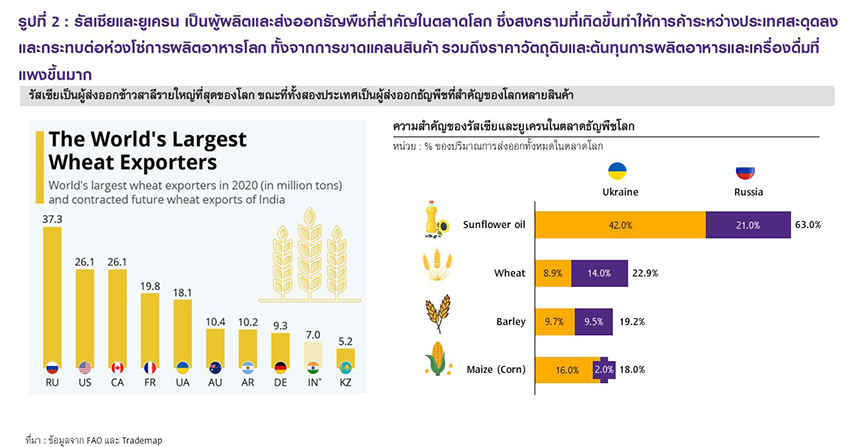 ทั้งนี้เนื่องจากทั้งสองประเทศเป็นผู้ผลิตและส่งออกธัญพืชที่สำคัญของโลกหลายชนิด (รูปที่ 2) โดยรัสเซียเป็นผู้ส่งออกข้าวสาลีรายใหญ่ที่สุดในตลาดโลก ขณะที่ยูเครนก็เป็นผู้ส่งออกธัญพืชรายใหญ่อันดับ 4 ของโลก โดยมีสินค้าส่งออกสำคัญ อาทิ น้ำมัน ดอกทานตะวัน (42%) ข้าวโพด (16%) ข้าวบาร์เลย์ (10%) และข้าวสาลี (9%) เป็นต้น นอกจากนี้ การสู้รบที่เกิดขึ้นยังทำให้ไม่สามารถเพาะปลูกหรือเก็บเกี่ยวผลผลิตในบางพื้นที่ได้ ยิ่งไปกว่านั้น ราคาปุ๋ยและเคมีภัณฑ์ทางการเกษตรต่าง ๆ ยังปรับตัวสูงขึ้นมากอีกด้วย เนื่องจากรัสเซียเป็นผู้ส่งออกวัตถุดิบสำหรับทำปุ๋ยเคมีรายใหญ่ของโลก ทำให้ต้นทุนการผลิตสินค้าเกษตรและเกษตรแปรรูป รวมทั้งผลิตภัณฑ์อาหารต่าง ๆ ซึ่งเป็นปลายน้ำของห่วงโซ่การผลิตอุตสาหกรรมอาหารแพงขึ้นตามไปด้วย