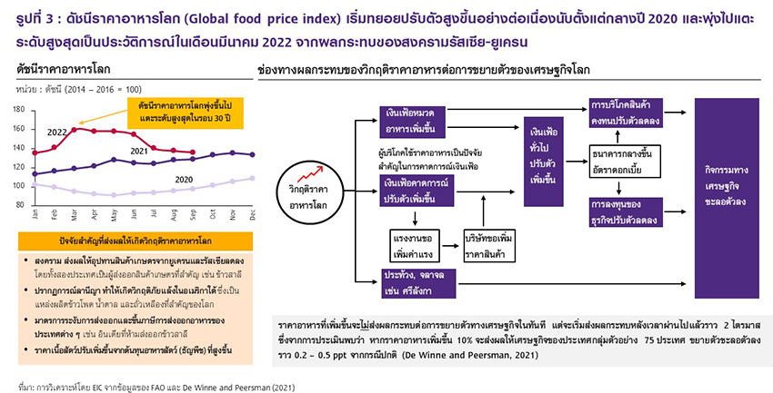 สถานการณ์ดังกล่าวได้ส่งผลให้เกิดปัญหาขาดแคลนอาหารขึ้นในหลายประเทศ โดยเฉพาะอย่างยิ่งในประเทศที่ไม่สามารถผลิตอาหารให้เพียงพอต่อความต้องการบริโภคภายในประเทศตนเอง และจำเป็นต้องพึ่งการนำเข้าอาหารจากต่างประเทศในสัดส่วนที่สูง อาทิ ประเทศในภูมิภาคตะวันออกกลางและทวีปแอฟริกา อีกทั้งยังกดดันให้ราคาอาหารในตลาดโลกปรับตัวสูงขึ้นอีกด้วย โดยจากข้อมูลพบว่าดัชนีราคาอาหารโลก (Global food price index) ขององค์การอาหารและการเกษตรแห่งสหประชาชาติ (Food and Agriculture Organization of the United Nations : FAO) (รูปที่ 3) ได้ทยอยปรับตัวสูงขึ้นอย่างต่อเนื่องนับตั้งแต่ช่วงกลางปี 2020 และได้พุ่งขึ้นไปแตะระดับ 159.7 ในเดือนมีนาคม 2022 หรือเพิ่มขึ้นราว 40%YOY ซึ่งนับเป็นระดับที่สูงที่สุดในรอบ 30 ปีอีกด้วย ซึ่งเป็นผลกระทบจากสงครามรัสเซีย-ยูเครน ที่ทำให้มีการปิดท่าเรือขนส่งสินค้าต่าง ๆ ของยูเครน สถานการณ์ดังกล่าวยิ่งเพิ่มแรงกดดันต่ออัตราเงินเฟ้อและค่าใช้จ่ายด้านอาหารของครัวเรือนทั่วโลก และส่งผลให้วิกฤติความมั่นคงด้านอาหารยิ่งทวีความรุนแรงมากขึ้นตามลำดับ