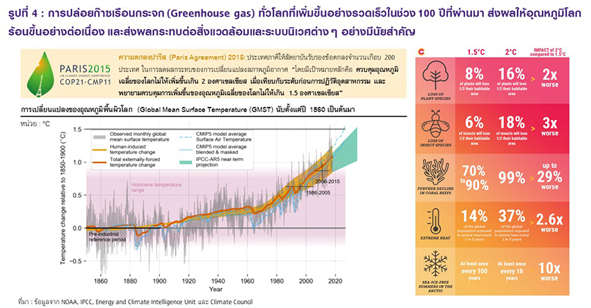 และประการสุดท้ายคือ การเปลี่ยนแปลงของสภาพภูมิอากาศโลก หรือ Climate change ซึ่งนับได้ว่าเป็นอีกหนึ่งในสาเหตุสำคัญที่มีส่วนทำให้วิกฤติความมั่นคงด้านอาหารทั่วโลกมีแนวโน้มรุนแรงมากขึ้น ซึ่งเป็นผลจากสภาพภูมิอากาศโลกที่มีความผิดเพี้ยนจากปกติ รวมทั้งยังมีแนวโน้มเกิดถี่ขึ้นและรุนแรงมากขึ้นเรื่อย ๆ อีกด้วย ไม่ว่าจะเป็นสภาพอากาศแบบสุดขั้วทั้งร้อนจัดและหนาวจัด คลื่นความร้อน พายุไต้ฝุ่น รวมทั้งปัญหาภัยแล้งและน้ำท่วม รวมไปถึงเหตุการณ์ภัยพิบัติในภูมิภาคต่าง ๆ ทั่วโลก เช่น ดินถล่ม ภูเขาไฟระเบิด รวมไปถึงแนวโน้มอุณหภูมิเฉลี่ยของโลกที่เพิ่มสูงขึ้นอย่างต่อเนื่อง (รูปที่ 4) ซึ่งปัญหาดังกล่าวส่งผลกระทบโดยตรงต่อความเหมาะสมทางกายภาพในการทำเกษตรกรรม การทำฟาร์มปศุสัตว์ รวมทั้งยังมีผลต่อสภาพแวดล้อมโดยรวมในระบบนิเวศอีกด้วย และส่งผลกระทบต่อเนื่องให้ปริมาณผลผลิตทางการเกษตรของโลกโดยรวมมีแนวโน้มปรับลดลง