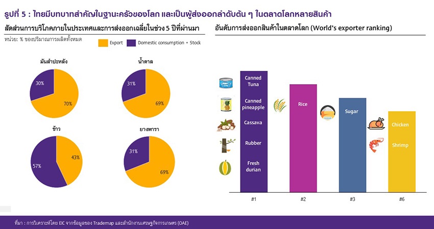 EIC มองว่าการส่งออกสินค้าเกษตรแปรรูปและอาหารของไทยน่าจะได้รับประโยชน์จากวิกฤติขาดแคลนอาหารที่เกิดขึ้น เนื่องจากไทยเป็นประเทศผู้ส่งออกสินค้าอาหารลำดับต้น ๆ ของโลก (รูปที่ 5) และมีบทบาทสำคัญในฐานะครัวโลก (Kitchen of the world) อยู่แล้ว เนื่องจากมีผลผลิตทางการเกษตรที่หลากหลายและมีคุณภาพเป็นที่ยอมรับในตลาดโลก อีกทั้งยังสามารถผลิตได้ในปริมาณที่มากเพียงพอสำหรับการบริโภคภายในประเทศและส่งออก ไม่ว่าจะเป็นสินค้าเกษตรที่เป็นพืชอาหารสำคัญ เช่น ข้าว มันสำปะหลัง น้ำตาล ซึ่งไทยเป็นผู้นำหรือผู้ส่งออกลำดับต้น ๆ ในตลาดโลกอยู่แล้ว รวมทั้งผลไม้สดอย่างทุเรียน หรือสินค้าเกษตรและประมงแปรรูปอย่างสับปะรดกระป๋องและทูน่ากระป๋อง ซึ่งเป็นสินค้าที่ไทยมีศักยภาพทางการแข่งขันและครองตำแหน่งผู้ส่งออกอันดับ 1 ของโลกมาอย่างยาวนาน