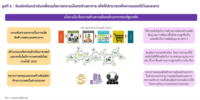EIC มองว่าการดำเนินนโยบายเรื่องความมั่นคงด้านอาหารเชิงรุกของคู่ค้าอย่างจีน ถือเป็นความเสี่ยงที่สำคัญต่อแนวโน้มการส่งออกสินค้าในกลุ่มธัญพืช พืชอาหาร ผลไม้ เนื้อสัตว์ รวมถึงผลิตภัณฑ์อาหารของไทยในระยะยาว เนื่องจากจีนมีแนวโน้มที่จะนำเข้าสินค้าดังกล่าวลดลงอย่างต่อเนื่อง และหันไปพึ่งพาผลผลิตภายในประเทศมากขึ้น และ/หรือ นำเข้าจากพันธมิตรทางธุรกิจของตนเองในต่างประเทศแทน ซึ่งจะทำให้มูลค่าการส่งออกสินค้าในกลุ่มพืชอาหาร เกษตรแปรรูป และอาหารของไทยไปยังตลาดจีนทยอยปรับลดลงตามไปด้วย เนื่องจากจีนเป็นคู่ค้าหลักของไทยในสินค้าอาหารหลายชนิด อาทิ ไก่สดแช่เย็นแช่แข็ง กุ้งสดแช่เย็นแช่แข็ง รวมทั้งผลไม้สดต่าง ๆ โดยเฉพาะอย่างยิ่งทุเรียนและลำไย เป็นต้น