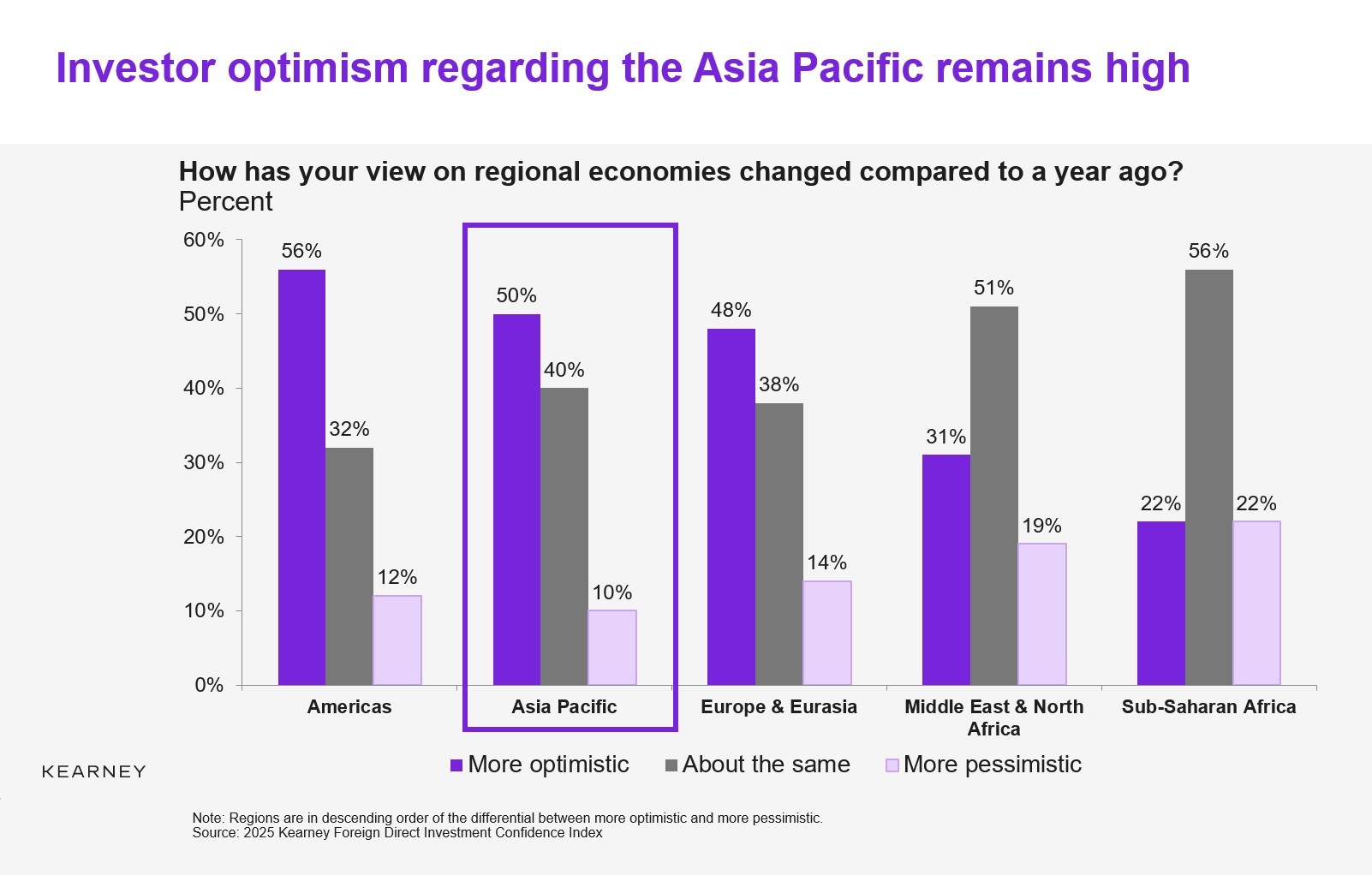 ผลการสำรวจยังพบว่านักลงทุนในภูมิภาคเอเชียแปซิฟิก 82% ได้วางแผนเพิ่มการลงทุน FDI ในช่วงสามปีข้างหน้า และ 50% มีมุมมองต่อเศรษฐกิจของภูมิภาคนี้ในเชิงบวกมากกว่าปีที่ผ่านมา