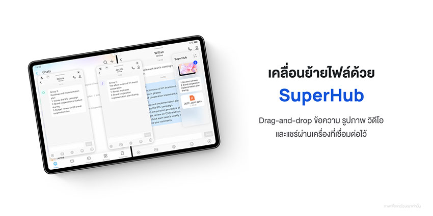 ด้วยระบบปฏิบัติการ HarmonyOS คุณสามารถถ่ายโอนรูปภาพ วิดีโอ และแม้แต่ข้อความจำนวนมากด้วยการลากและวางที่ง่ายดายเพียงครั้งเดียว เพียงคุณกดที่ข้อความ รูปภาพ วิดีโอ และไฟล์ใดๆ ค้างไว้ แล้วลากไปที่หน้าต่างลอยของ SuperHub เพื่อเก็บไฟล์ไว้ชั่วคราว จากนั้นผู้ใช้สามารถสลับไปยังแอปพลิเคชันอื่น เลือกไฟล์ภายใน SuperHub เพื่อการ Copy และ Paste ได้อย่างสะดวก ด้วยความสามารถในการถ่ายโอนแบบกลุ่ม ผู้ใช้ยังสามารถใช้ SuperHub สำหรับการถ่ายโอนหลายไฟล์ระหว่างสมาร์ทโฟน แท็บเล็ต และพีซีได้อย่างไร้รอยต่ออีกด้วย