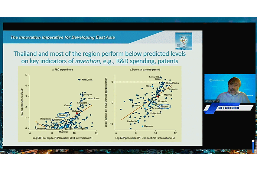 รายงานของธนาคารโลกเกี่ยวกับนวัตกรรมในการพัฒนาเอเชียตะวันออกเน้นย้ำถึงย้ำถึงความสำคัญของนวัตกรรมในการขับเคลื่อนการฟื้นฟูด้านเศรษฐกิจอย่างยั่งยืน อย่างไรก็ดี หลายประเทศในภูมิภาคนี้ รวมถึงประเทศไทย ยังไม่สามารถพัฒนาให้เท่าทันกับประเทศผู้นำด้านนวัตกรรมได้ เช่น ญี่ปุ่น เกาหลีใต้ สิงคโปร์ และจีน โดยประเทศไทยนั้นจัดอยู่ในกลุ่มประเทศรองลงมาร่วมกับมาเลเซีย เวียดนาม และมองโกเลีย โดยมาเลเซียมีการพัฒนาด้านนวัตกรรมที่ใกล้กับประเทศผู้นำฯ มากที่สุด
