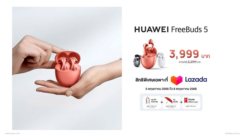 และสำหรับ HUAWEI FreeBuds 5 ราคาพิเศษเพียง 3,999 บาท จากราคาปกติ 5,299 บาท เมื่อสั่งซื้อตั้งแต่วันที่ 5 พฤษภาคม 2566 – 8 พฤษภาคม 2566 ที่ร้านค้าอย่างเป็นทางการของหัวเว่ยบน Lazada รับฟรี กระเป๋า Canvas Bag มูลค่า 790 บาท และ ร่ม Huawei มูลค่า 390 บาท สำหรับลูกค้า 100 ท่านแรกเท่านั้น และนอกจากนี้ยังมีส่วนลดมูลค่า 100 บาท เมื่อใช้ร่วมกับคูปอง สามารถติดตามรายละเอียดโปรโมชันได้ที่นี่ และกดสั่งซื้อผลิตภัณฑ์ได้ที่นี่สามารถติดตามรายละเอียดโปรโมชันได้ที่นี่ และกดสั่งซื้อผลิตภัณฑ์ได้ที่นี่