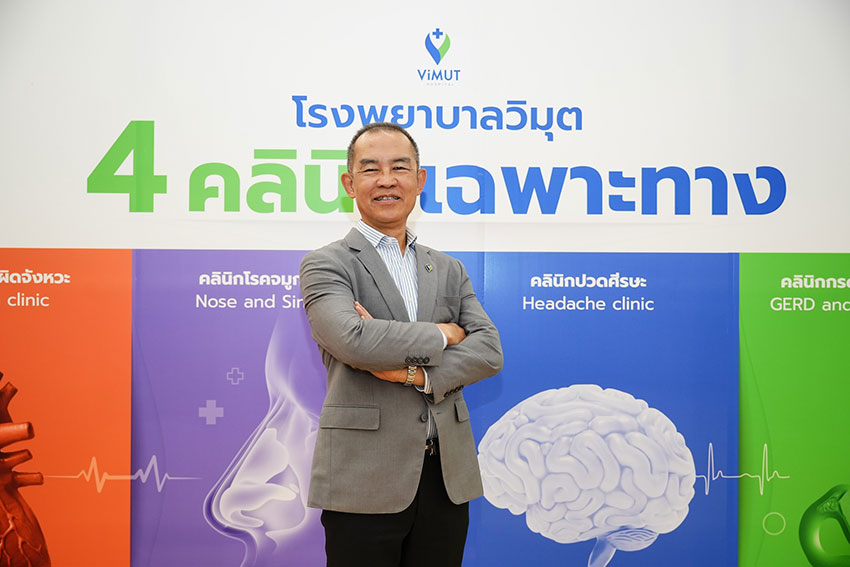 นายแพทย์สมบูรณ์ ทศบวร ผู้อำนวยการโรงพยาบาลวิมุต กล่าวว่า “รพ. วิมุต เล็งเห็นว่าปัญหาสุขภาพเป็นเรื่องสำคัญที่ต้องใส่ใจเป็นอันดับต้นๆ ของคนทุกเพศทุกวัย และโดยเฉพาะในประชากรวัยทำงานที่ได้กลายเป็นความท้าทายของหลายประเทศทั่วโลก เพราะช่วงวัยดังกล่าวถือเป็นกำลังหลักในการขับเคลื่อนประเทศ คนเหล่านี้ทุ่มเทแรงกายและแรงใจเพื่อทำงานหาเลี้ยงตนเองและครอบครัว ทำให้ไม่มีเวลาดูแลสุขภาพ ละเลยสัญญาณที่ร่างกายแสดงออกมา บ่อยครั้งกว่าจะรู้ตัวก็ป่วยหนัก ในฐานะผู้ให้บริการเฮลท์แคร์แบบองค์รวมที่ตอบโจทย์เทรนด์สุขภาพยุคใหม่อยู่เสมอ รพ. วิมุต มุ่งมั่นมอบการดูแลสุขภาพที่เข้าใจของคนทุกวัยจึงได้เปิด 4 คลินิกเฉพาะทาง ภายใต้การดูแลของแพทย์ผู้ชำนาญการ ได้แก่ คลินิกปวดศีรษะ, คลินิกกรดไหลย้อนและท้องผูก, คลินิกหัวใจเต้นผิดจังหวะ และคลินิกโรคจมูกและไซนัส เพิ่มศักยภาพในการดูแลรักษาผู้ป่วยโรคยอดฮิต และผู้ป่วยที่มีอาการจากโรคที่เป็นภัยเงียบ อาทิ โรคหัวใจเต้นผิดจังหวะ โรคกรดไหลย้อน โรคไมเกรน โรคไซนัสอักเสบ และโรคภูมิแพ้ ทุกการรักษาอยู่บนพื้นฐานด้านความปลอดภัยในระดับสากล ส่งมอบบริการทางการแพทย์ที่ไร้รอยต่อแบบครอบคลุม ด้วยจุดแข็งด้านการดูแลรักษาผู้ป่วยตั้งแต่ป้องกัน-รักษา-ฟื้นฟู ตอบโจทย์ผู้ใช้บริการยุคใหม่โดยผสานความรู้ของทีมงานในทุกศูนย์เฉพาะทางที่ทำงานร่วมกันเพื่อส่งต่อและติดตามการรักษาตั้งแต่ต้นจนจบได้อย่างราบรื่น พร้อมรักษาเจาะลึกอาการและโรคด้วยความเชี่ยวชาญจากแพทย์เฉพาะทางที่มีความพร้อมในการรักษา โดยมีนวัตกรรมและเครื่องมือที่ทันสมัย เจาะลึกถึงสาเหตุต้นตอของโรค ทำให้ผู้ใช้บริการทุกคนมั่นใจและอบอุ่นใจได้”