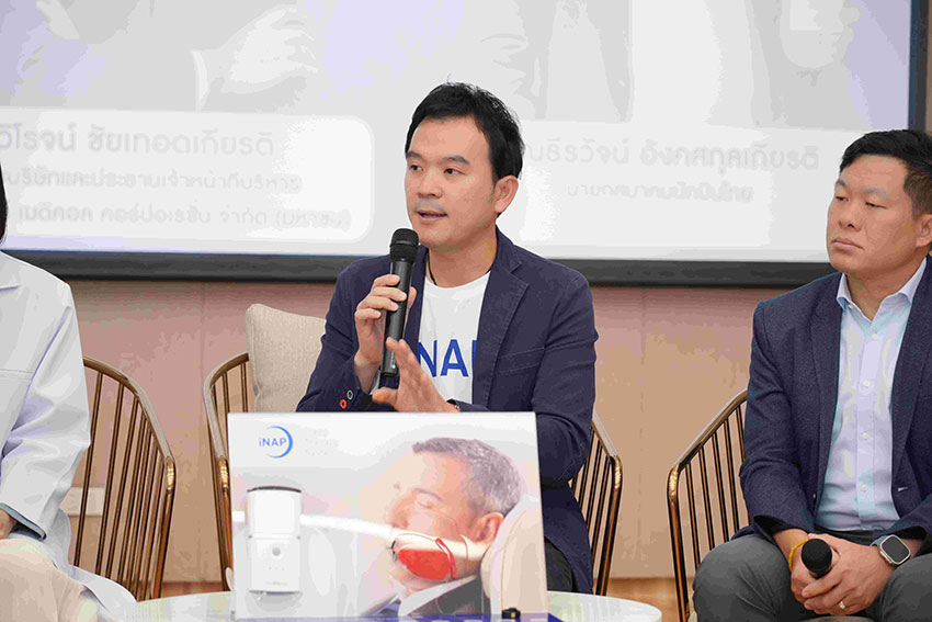 คุณวิโรจน์ ชัยเทอดเกียรติ กรรมการบริษัทและประธานเจ้าหน้าที่บริหาร บริษัท นําวิวัฒน์ เมดิคอล คอร์ปอเรชั่น จํากัด (มหาชน) หรือ NAM กล่าวว่า "ปัจจุบันทั่วโลกและคนไทยเริ่มตระหนักรู้ถึงความสำคัญของคุณภาพการนอนหลับและภัยเงียบที่เกิดจากการนอนที่ไม่มีคุณภาพ โดยข้อมูลของ Research And Markets บริษัทวิจัยตลาดชั้นนำระบุว่าตลาดเครื่องมือแพทย์ในการรักษาภาวะหยุดหายใจขณะหลับทั่วโลกจะมีมูลค่าถึง 9.95 พันล้านดอลลาร์สหรัฐภายในปี 2573 โดยขยายตัวที่ CAGR ที่ 7.34% จากปี 2567 ถึง 2573 ปัจจุบันตลาดประเมินไว้ที่ 6.06 พันล้านดอลลาร์สหรัฐ ณ ปี 2566 โดยนำวิวัฒน์ เมดิคอล คอร์ปอเรชั่น ในฐานะผู้ผลิต นำเข้า และจำหน่ายเครื่องมือและอุปกรณ์ทางการแพทย์และบริการอื่น ๆ ในธุรกิจด้านสุขภาพด้วยประสบการณ์มากกว่า 50 ปีในการทำงานร่วมกับโรงพยาบาลและสถานพยาบาลชั้นนำ เรามีความมุ่งมั่นที่จะนำเสนอนวัตกรรมทางการแพทย์ที่ทันสมัยและมีประสิทธิภาพ เพื่อช่วยเหลือผู้ป่วยให้มีคุณภาพชีวิตที่ดีขึ้น การเปิดตัว iNAP Sleep Therapy System ในครั้งนี้ ถือเป็นอีกหนึ่งก้าวสำคัญในการเพิ่มทางเลือกใหม่สำหรับการดูแลผู้ป่วยโรคหยุดหายใจขณะหลับในประเทศไทย และเป็นการเปิดตัวที่โรงพยาบาลแห่งแรกในประเทศไทย โดย iNAP One Sleep Therapy System ถือเป็นนวัตกรรมใหม่ออกแบบมาเพื่อลดการอุดกั้นทางเดินหายใจส่วนบน ซึ่งเป็นสาเหตุของการนอนกรน ทำงานด้วยเทคโนโลยี Oral Negative Air Pressure Therapy สร้างแรงดูดอ่อน ๆ ทำให้ลิ้นและเนื้อเยื่ออยู่ในตำแหน่งที่เหมาะสม ช่วยให้หายใจได้อย่างเป็นธรรมชาติขณะที่นอนหลับ ด้วยรูปลักษณ์ที่สะดวกต่อการพกพา มีขนาดเล็กกะทัดรัด และสามารถนำขึ้นเครื่องบินได้ ไม่ต้องเสียบปลั๊ก ใช้งานได้นาน 4-6 วัน ทั้งยังเป็นอุปกรณ์ที่ได้รับการทดสอบและรับรองจากสำนักงานคณะกรรมการอาหารและยา (อย.) ในประเทศไทย รวมทั้งผ่านการรับรองจากองค์การอาหารและยาสหรัฐ (FDA) และในประเทศไต้หวัน อีกทั้งยังได้รับรางวัลต่าง ๆ มากมายจากองค์กรชั้นนำ พร้อมการยอมรับจากแพทย์และนักวิจัยในหลายประเทศ ว่ามีประสิทธิภาพและมีความปลอดภัยในการลดภาวะหยุดหายใจขณะหลับในทุกระดับความรุนแรง”