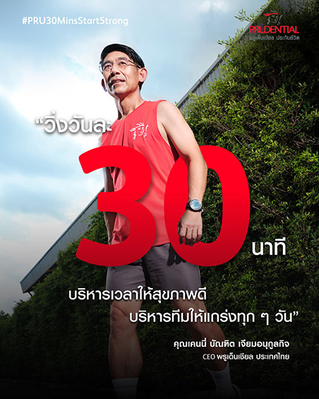 นายบัณฑิต เจียมอนุกูลกิจ ประธานเจ้าหน้าที่บริหาร พรูเด็นเชียล ประเทศไทย กล่าวว่า “ผมเชื่อว่าพลังของมนุษย์เริ่มต้นจากความเชื่อมั่นและการดูแลตัวเองก่อนเสมอ การที่เราเริ่มต้นเช้าวันใหม่ด้วยความแข็งแรง ไม่เพียงแต่จะส่งผลดีต่อร่างกาย แต่ยังเป็นการสร้างกรอบความคิด (mindset) ที่ดีและพร้อมรับมือกับทุกสิ่งไปตลอดทั้งวัน แคมเปญ #PRU30MinsStartStrong คือจุดเริ่มต้นเล็กๆ ที่อยากเชิญชวนให้ทุกคนมาสร้างการเปลี่ยนแปลงที่ยิ่งใหญ่ไปด้วยกัน เพราะสุขภาพที่ดีคือหลักประกันแรกของชีวิต รวมถึงปีนี้ถือว่ามีความพิเศษอย่างยิ่ง เนื่องจากเป็นปีแห่งการฉลองครบรอบ 30 ปีของการดำเนินธุรกิจในประเทศไทย จึงอยากเชิญชวนทุกคนหันมาขยับร่างกายวันละ 30นาที โดยสามารถเริ่มต้นง่ายๆได้ทันที ไม่ว่าจะเป็น การเดิน วิ่งช้าๆ โยคะ หรือ แม้แต่การยืดเหยียดเบาๆ ก็สามารถสร้างความเปลี่ยนแปลงให้ร่างกายวันละนิดเพื่อมีสุขภาพดีไปด้วยกัน”