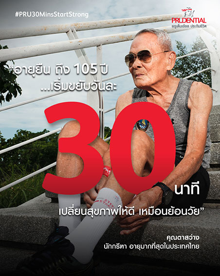 สำหรับแคมเปญ #PRU30MinsStartStrong ยังได้รับการถ่ายทอดเรื่องราวจากเหล่า “PRUHeros” ที่พร้อมส่งต่อแรงบันดาลใจผ่าน Youtube ของ Prudential Thailand “4 เรื่องจริง กับ30 นาทีเปลี่ยนชีวิต” (https://www.youtube.com/watch?v=3VJFiGiUoS0 ) หนึ่งในนั้นคือเรื่องราวของ คุณตาสว่าง จันทร์พราหมณ์ นักกรีฑาวัย 105 ปี ที่เริ่มต้นออกกำลังกายเมื่ออายุเกือบ 100 ปี ด้วยความตั้งใจที่จะไม่เป็นเพียงผู้เฝ้าดูชีวิต แต่ขอ “มีชีวิต” เพื่อสิ่งที่รักและคนที่รัก คุณตาสว่าง เริ่มต้นด้วยการออกกำลังกายวันละ 30 นาทีอย่างสม่ำเสมอ จนสามารถคว้า 3 เหรียญทอง รวมถึงสร้างสถิติเป็นนักกีฬาไทยที่มีอายุมากที่สุดที่ได้รับเหรียญทอง จากการแข่งขันมหกรรมกีฬาสูงอายุโลก เวิลด์ มาสเตอร์ เกมส์ 2025 ที่ไต้หวัน ด้วยความเชื่อว่า “ผมไม่อยากเป็นแค่คนดูชีวิตของตัวเอง ผมอยากมีชีวิตอยู่เพื่อสิ่งที่รักและคนที่รัก การออกกำลังกายวันละ 30 นาที ทำให้ผมแข็งแรง มีพลัง และมีความสุขทุกวัน”