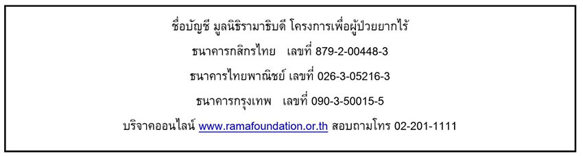 มูลนิธิรามาธิบดีฯ มุ่งมั่นที่จะมอบโอกาสในการเข้าถึงการรักษาพยาบาลที่ดีและมีประสิทธิภาพให้กับผู้ป่วยที่ขาดแคลนทุนทรัพย์ภายใต้ “โครงการเพื่อผู้ป่วยยากไร้” เพื่อระดมเงินทุนสนับสนุนงบประมาณท่อค้ำหลอดลมให้แก่ผู้ป่วยโรคมะเร็งที่ไม่สามารถเบิกจ่ายได้ตามสิทธิการรักษา จำนวน 1,000,000 บาท และสนับสนุนงบประมาณในการช่วยเหลือผู้ป่วยโรคแพ้ภูมิตัวเอง จำนวน 2,000,000 บาท เพื่อต่อชีวิตให้กับผู้ป่วยที่ยังรอคอยความช่วยเหลือ และส่งเสริมคุณภาพชีวิตและสุขภาวะที่ดีของคนไทย ร่วมเป็นส่วนหนึ่งของ “การให้” ที่ยิ่งใหญ่ ร่วมบริจาคกับมูลนิธิรามาธิบดีฯ