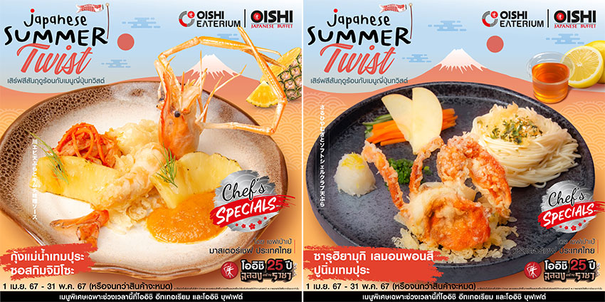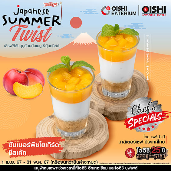 อิ่ม โอ-ร่อย เทศกาล “Japanese Summer Twist” พร้อมเมนูใหม่ในธีม “Japanese Sense & Inspiration” ขอแนะนำอาหารจานพิเศษ...รสชาติที่มีชีวิตชีวา แบบฉบับ เชฟเป่าเป้ มาสเตอร์เชฟ ประเทศไทย พลาดไม่ได้ ทั้ง เมนู “กุ้งแม่น้ำเทมปุระ ซอสมิโซะกิมจิ” เมนูที่คัดสรรกุ้งแม่น้ำตัวโต ๆ มาทอดในสไตล์เทมปุระ เสิร์ฟมากับน้ำซอสสูตรพิเศษ ที่ผสานรสชาติความเข้มข้นของกิมจิและความกลมกล่อมของมิโซะ...สุดลงตัว รับประทานพร้อมสับปะรดคาราเมลไลซ์ ให้รสชาติที่อร่อยและสดชื่นไม่เบา เมนู “ซารุฮิยามุกิ ปูนิ่มเทมปุระ” เสิร์ฟฮิยามุกิ (หรืออุด้งเส้นเล็ก) แบบเย็น ๆ เส้นเหนียวนุ่ม คู่ซอสพอนสึเลมอน เปรี้ยวกลมกล่อม รับประทานพร้อมปูนิ่มเทมปุระ ผัก และแอปเปิ้ลดอง หลากสีสัน เป็นเมนูที่ช่างสดชื่นและลงตัว และ เมนูขนมหวาน “ซัมเมอร์พีชโยเกิร์ตชีสเค้ก” ชีสเค้ก เนื้อสัมผัสเนียนนุ่ม เติมรสชาติเปรี้ยวอมหวาน...ลงตัว ด้วยโยเกิร์ต และซอสลูกพีชเข้มข้น รับประทานแบบเย็น ๆ ยิ่งอร่อยชื่นใจไปอีก