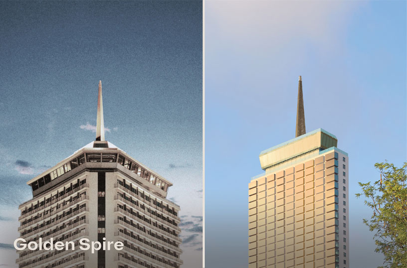 ยอดเสาปลายแหลมสีทองบนยอดตึกที่ได้ถูกออกแบบครั้งแรกเมื่อกว่า 50 ปีที่แล้ว โดยสถาปนิกญี่ปุ่น Mr. Yozo Shibata หัวหน้าสถาปนิกเป็นผู้ออกแบบจากบริษัท Kanko Kikaku Sekkeisha (KKS) โดยการออกแบบนั้นได้แรงบันดาลใจมาจาก ยอดของพระปรางค์ วัดอรุณราชวราราม จนกลายเป็นอัตลักษณ์สำคัญที่ใครเห็นก็ล้วนทราบว่าสถานที่แห่งนี้ คือ เมืองดุสิตธานี และด้วยความมุ่งมั่นที่จะทำให้อัตลักษณ์สอดคล้องกับการเปลี่ยนแปลงของยุคสมัยที่ยังคงมีความสวยงามและดึงดูดสายตาของคนไทยและคนทั่วโลก เราจึงได้สร้างสรรค์ยอดเสาใหม่ที่มีลักษณะโปร่งเพื่อยังคงมองเห็นยอดเสาสีทองเดิมด้านในอย่างชัดเจนโดยมีความสวยงามร่วมสมัยมากขึ้นและมีขนาดที่ใหญ่ขึ้น เพื่อให้เกิดความสมดุลกับขนาดของอาคารโรงแรมใหม่ 39 ชั้น เสมือนเป็นจุดเชื่อมต่อแห่งยุคสมัยที่ยังคงรักษามรดกที่สืบต่อมาอย่างยาวนาน โดยที่นี่จะกลายเป็นจุดชมวิว เช็คอิน และกลับมาเป็นสัญลักษณ์ของกรุงเทพฯ เหมือนที่เคยเป็นมา