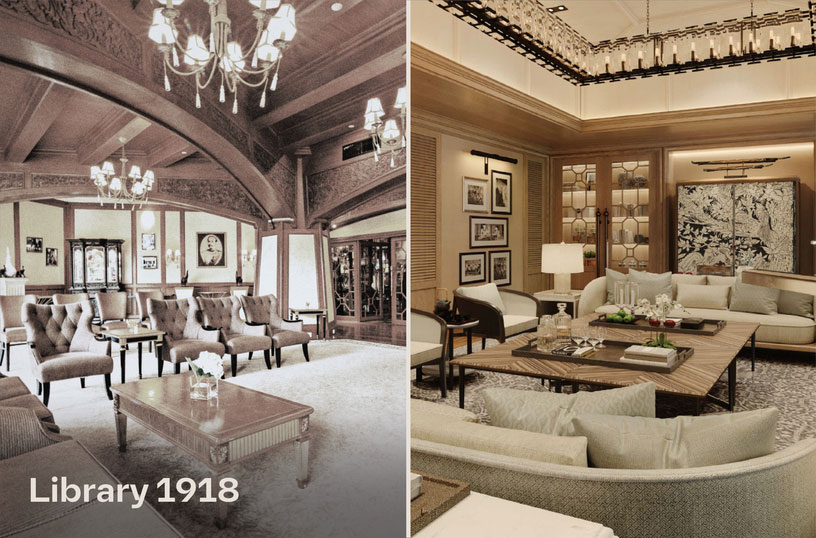 ก่อนที่จะมาเป็น ห้องไลบรารี่ นั้น ห้องนี้เคยเป็นห้องอาหารอิตาเลียน และห้องจัดเลี้ยงนํ้าชาที่จัดถวายเป็นพระบรมราชานุสรณ์ในรัชกาลที่ 6 ภายหลังเมื่อได้ปรับมาเป็นห้องประชุมจึงได้ออกแบบให้ภายในห้องตกแต่งด้วยหัตถศิลป์งานฉลุไม้ที่สง่างามประดับตกแต่งด้วยพระบรมฉายาลักษณ์ และมีข้าวของเครื่องใช้ในองค์รัชกาลที่ 6 ซึ่งของสะสมต่างๆ เหล่านี้ถือเป็นการเทิดพระเกียรติองค์รัชกาลที่ 6 ในฐานะผู้สร้างเมืองจำลองดุสิตธานีขึ้น เพื่อใช้ทดลองการปกครองระบอบประชาธิปไตยในปี พ.ศ. 2461 (ค.ศ. 1918) ห้องดังกล่าวได้ถูกใช้สำหรับการจัดงานขนาดเล็กในโอกาสต่างๆ อาทิ พิธีหมั้นแบบไทย การจัดเลี้ยงรับรองเป็นการส่วนพระองค์แก่ราชวงศ์ และบุคคลสำคัญชั้นนำทั้งจากไทยและต่างประเทศ