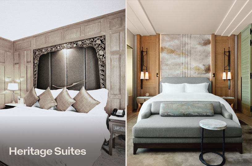 จากอดีตถึงปัจจุบัน ห้องสวีทที่โรงแรมดุสิตธานี กรุงเทพ นับว่าเป็นต้นแบบความเป็นไทยที่แท้จริงไม่ว่าชาวไทยหรือชาวต่างชาติ ต่างก็หลงใหลตั้งแต่แรกเข้าพัก โดยมีเอกลักษณ์ของการออกแบบบวกกับการตกแต่งห้องที่รังสรรค์อย่างประณีตบรรจงผ่านการสอดแทรกวัฒนธรรมและความเป็นอยู่อย่างไทยในแบบฉบับของโรงแรมดุสิตธานี กรุงเทพ อาทิ การนำเอาเอกลักษณ์ความเป็นไทยอย่างลายลูกฟักและผนังไม้ฝาปะกนบ้านไทยมาร่วมตกแต่งภายในห้อง ด้านบริเวณหัวเตียงที่ยังคงใส่ใจในรายละเอียดด้วยการเพิ่มลวดลายที่ปักด้วยมือทุกชิ้นสื่อความหมายถึงสรวงสวรรค์ และการเลือกใช้เฟอร์นิเจอร์ที่มีรูปร่างโค้งนุ่มนวลแบบไทยเพื่อทำให้องค์ประกอบของห้องดูร่วมสมัยมากขึ้น โดยการกลับมาใหม่ครั้งนี้ ห้องพักทั้ง 257 ห้องจะมีขนาดใหญ่ขึ้น และทั้งหมดสามารถมองเห็นความร่มรื่นของสวนลุมพินีได้อย่างเต็มตาผ่านช่องหน้าต่างที่เป็นกระจกบานใหญ่สูงจากพื้นจรดเพดาน ซึ่งตกแต่งด้วยขอบสีทองหรูหราเพื่อสื่อถึงภาพความทรงจำที่น่าประทับใจ และยังเสริมความพิเศษด้วยพื้นที่พักกายชมวิวริมหน้าต่างเพื่อให้ผู้พักอาศัยได้ผ่อนคลาย และชื่นชมความงดงามของธรรมชาติกับบรรยากาศอันแสนสงบจากภายในห้องพัก การตกแต่งภายในของโรงแรมดุสิตธานี กรุงเทพ ได้รับการออกแบบจาก André Fu Studio ซึ่งได้รับการยกย่องและเป็นที่ยอมรับในระดับสากล โดยการออกแบบได้คำนึงถึงความต่อเนื่องจากอดีตสู่ปัจจุบันอย่างลงตัว สื่อความหมายของคำว่า Heritage ได้อย่างสมบูรณ์