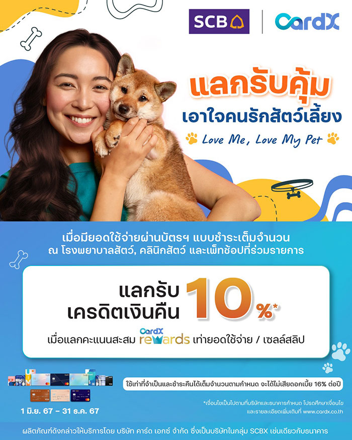 CardX พร้อมเอาใจบรรดา Pet Parent คนรักสัตว์เลี้ยงด้วยโปรโมชัน “แลกรับเครดิตเงินคืน” ถึง 10%* เมื่อมียอดใช้จ่ายแบบชำระเต็มจำนวน และแลกคะแนนสะสม CardX Rewards เท่ายอดใช้จ่าย / เซลล์สลิป ณ โรงพยาบาลสัตว์, คลินิกสัตว์, และเพ็ทช็อปที่ร่วมรายการ สิทธิพิเศษสำหรับบัตรเครดิต CardX และ SCB ตั้งแต่วันนี้ – 31 ธ.ค. 67
