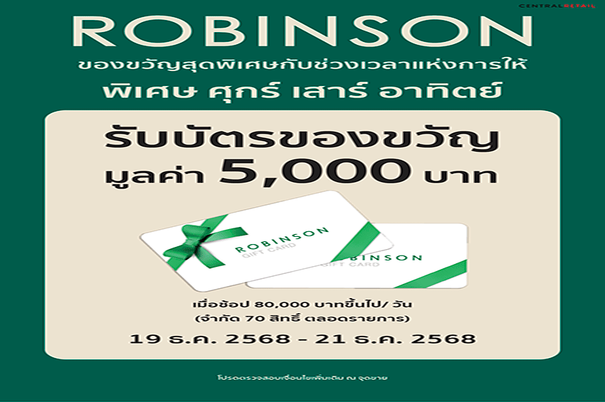 ภายใต้คอนเซ็ปต์ “ของขวัญสุดพิเศษ กับช่วงเวลาแห่งการให้” ที่มาพร้อมไอเทมของขวัญชิ้นเด็ดจากแบรนด์ชั้นนำ โปรโมชันสุดคุ้ม กิจกรรมสนุก ๆ พร้อมส่งต่อความสุขให้สังคมในบรรยากาศสุดอบอุ่น ตั้งแต่วันนี้ – 4 ม.ค. 69 ที่ห้างโรบินสันทุกสาขา รวมถึงช่องทางการช้อปปิ้งสุดสะดวกของห้างฯ