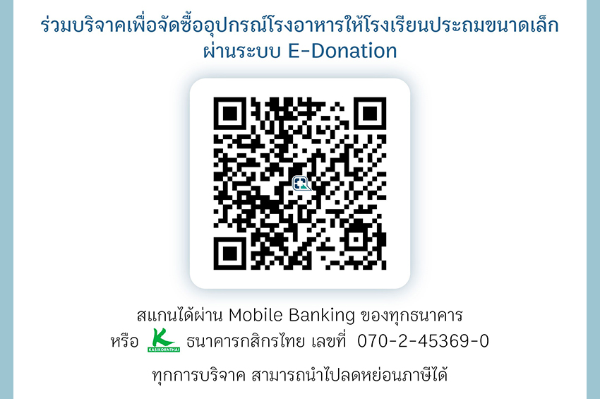 ในการบริจาคผู้สนใจเพียงสแกนคิวอาร์โค้ดผ่านระบบ E-donation พร้อมระบุจำนวนเงินที่ประสงค์จะร่วมบริจาค ทุก ๆ การบริจาคสามารถนำไปลดหย่อนภาษีได้ตามที่กฎหมายกำหนด ทั้งนี้ธนาคารจะเป็นผู้จัดนำส่งข้อมูลการบริจาคไปยังกรมสรรพากรเพื่อใช้สิทธิ์ในการลดหย่อนภาษีเงินได้ประจำปีต่อไป สำหรับผู้ที่บริจาคผ่านธนาคารกสิกรไทย บัญชีเลขที่ 070-2-45369-0 หลังการบริจาคแล้วกรุณาติดต่ออีเมล This email address is being protected from spambots. You need JavaScript enabled to view it. หรือ Line: @edfthai เพื่อขอรับใบเสร็จรับเงินในการนำไปใช้ลดหย่อนภาษีเงินได้ประจำปีตามกฎหมายต่อไป และหากต้องการข้อมูลเพิ่มเติมเกี่ยวกับโครงการสามารถติดต่อฝ่ายประชาสัมพันธ์มูลนิธิ EDF (วันจันทร์-วันศุกร์ เวลา 09.00-16.30 น.) โทรศัพท์ 02 579 9209-11 This email address is being protected from spambots. You need JavaScript enabled to view it.