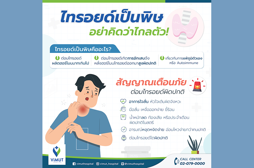 หลายคน ๆ อาจเคยมีเพื่อนหรือคนในครอบครัวที่ป่วยด้วยโรคนี้แล้ว แต่ไทรอยด์เป็นพิษกลับเป็นโรคอีกชนิดหนึ่งที่คนทั่วไปยังอาจไม่เข้าใจว่ามันเกิดจากอะไร อันตรายแค่ไหน หรือใครที่เสี่ยงต่อโรคนี้บ้าง วันนี้ นพ. ปริญญา สมัครการไถ อายุรแพทย์ แพทย์ผู้ชำนาญการโรคเบาหวานและต่อมไร้ท่อ โรงพยาบาลวิมุต จะมาอธิบายอย่างง่าย ๆ ให้เราเข้าใจเกี่ยวกับโรคนี้มากขึ้น แถมวิธีสังเกตอาการที่น่าสงสัยซึ่งอาจนำไปสู่ไทรอยด์เป็นพิษได้