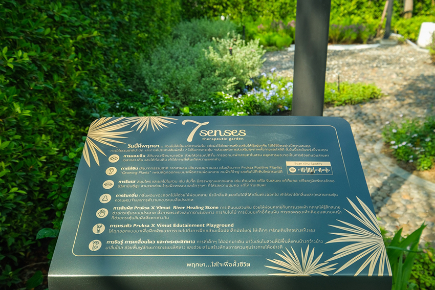 - การสัมผัส Pruksa X ViMUT River Healing Stone สวนหินที่ออกแบบร่วมกับทีมโรงพยาบาลวิมุต เพื่อการเดินบนสวนหิน ช่วยให้ผ่อนคลายกับการนวดเท้า กดจุดให้รู้สึกสบาย ช่วยกระตุ้นระบบประสาททั้งการทรงตัวและการกะระยะหาง ไปจนถึงสัมผัสจากการจับใบไม้ การนั่งบนเก้าอี้ก้อนหิน การถอดรองเท้าเดินบนสนามหญ้า ก็ช่วยกระตุ้นระบบประสาทที่แตกต่างกัน