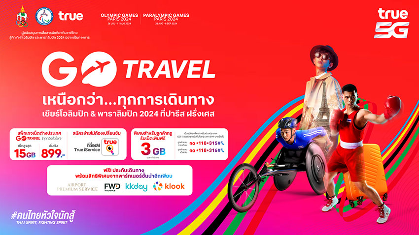 ทั้งนี้ สำหรับทุกการเดินทางให้สนุก สะดวกสบาย ไปกับ GO Travel แพ็กเกจเน็ตต่างประเทศ ที่ให้คุณเชียร์ได้สุดตลอดศึกโอลิมปิก-พาราลิมปิกเกมส์และท่องเที่ยวทั่วโลกได้สุด ตอบโจทย์ทุกไลฟ์สไตล์ พิเศษสำหรับลูกค้าทรู (รายเดือนและเติมเงิน) ฟรี! เน็ตโรมมิ่งเพิ่ม 3GB (สำหรับประเทศฝรั่งเศสเท่านั้น) ที่สมัครแพ็กเกจเน็ตต่างประเทศ GO Travel (ทุกทวีปทั่วโลก) ราคา 899 บาทขึ้นไป ลูกค้าทรูรายเดือนกดรับสิทธิ์ *118*315# โทรออก ลูกค้าทรูเติมเงินกดรับสิทธิ์ *118*316# โทรออก เริ่มวันที่ 1 กรกฎาคม – 15 กันยายน 2567 พร้อมรับฟรี ประกันการเดินทางให้เที่ยวสนุกตลอดทริป และสิทธิพิเศษอีกมากมาย เพียงแค่นี้ก็สามารถเชียร์ทัพไทยแบบติดขอบสนาม และเชื่อมโยงทุกความรู้สึกกับครอบครัวแบบไร้พรมแดน