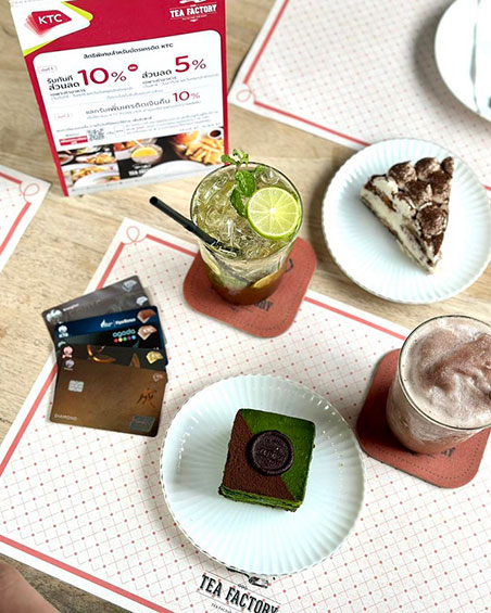 ร้าน TEA FACTORY AND MORE รับส่วนลด 10% เฉพาะค่าอาหาร (วันจันทร์ - วันศุกร์) รับส่วนลด 5% เฉพาะค่าอาหาร (วันเสาร์ วันอาทิตย์และวันหยุดนักขัตฤกษ์) พิเศษ แลกคะแนนรับเครดิตเงินคืน 10% เมื่อใช้คะแนน KTC FOREVER เท่ายอดใช้จ่ายผ่านบัตรเครดิต ระหว่างวันที่ 1 มกราคม 2567 - 31 ธันวาคม 2567