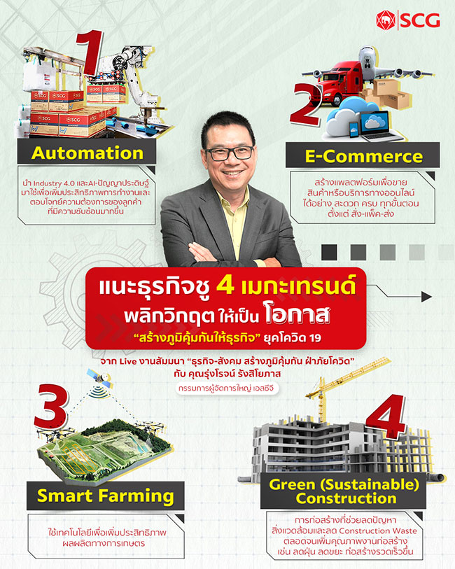 อย่างไรก็ตาม การกลายพันธุ์ของโควิด 19 หลายสายพันธุ์ในช่วงที่ผ่านมา โดยเฉพาะการระบาดของสายพันธุ์เดลต้า (Delta) ทำให้เชื่อว่าโควิด 19 จะไม่หมดไป ดังนั้น “การเรียนรู้ที่จะอยู่กับโควิด 19” จึงเป็นเรื่องที่ไม่อาจเลี่ยง โดยผ่านมุมมองของ “รุ่งโรจน์ รังสิโยภาส” กรรมการผู้จัดการใหญ่ เอสซีจี ได้เปิดมุมมองแนวคิดสำหรับภาคธุรกิจ มี “4 เทรนด์” สำคัญ ที่จะสร้างภูมิคุ้มกันฝ่าภัยโควิด 19 “พลิกวิกฤติเป็นโอกาส”