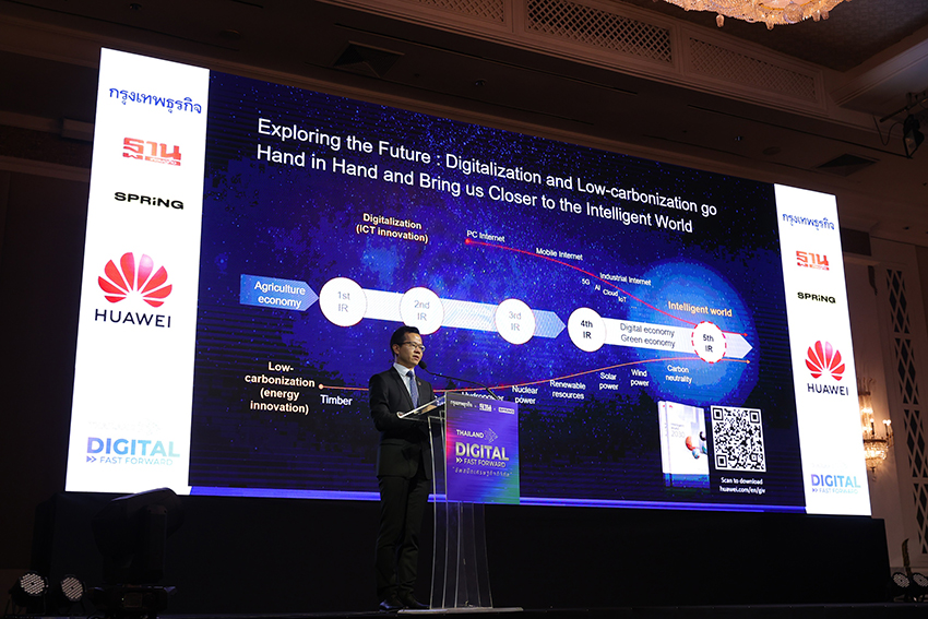 นอกจากการสร้างความยืดหยุ่นทางเศรษฐกิจแล้ว การเปลี่ยนแปลงเข้าสู่ยุคดิจิทัลยังเป็นหนทางสู่สังคมคาร์บอนต่ำและยั่งยืน โดยอ้างอิงตามรายงานของ World Economic Forum ประโยชน์ที่จะได้รับจากการเปลี่ยนแปลงเข้าสู่ดิจิทัลคือ การปล่อยคาร์บอนทั่วโลกจะลดลง 12 พันล้านตันภายในปี พ.ศ. 2653 สำหรับอุตสาหกรรมไอซีที เครือข่ายต่างๆ ที่จะใช้พลังงานอย่างมีประสิทธิภาพมากขึ้น 2.7 เท่า เพื่อขับเคลื่อนเรื่องโครงสร้างพื้นฐานสีเขียว โดยหัวเว่ยมองว่าประเทศไทยเป็นประเทศแรกในอาเซียนที่ให้ความมุ่งมั่นด้านความเป็นกลางด้านคาร์บอนอย่างจริงจัง ซึ่งหัวเว่ยจะช่วยสนับสนุนเป้าหมายสีเขียวของประเทศไทย ด้วยการรวบรวมเทคโนโลยีดิจิทัลและพาวเวอร์ อิเล็กทรอนิกส์ เพื่อพัฒนาพลังงานสะอาด รวมทั้งเปิดใช้งานการแปลงพลังงานเป็นดิจิทัลเพื่อขับเคลื่อนการปฏิวัติพลังงาน