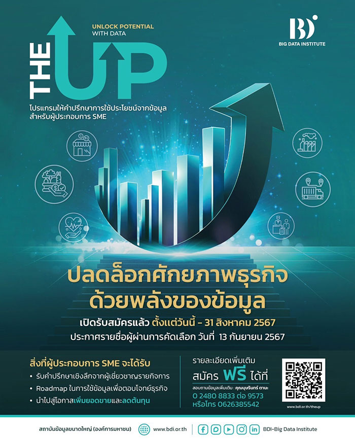 ด้าน ผศ. ดร.พร พันธุ์จงหาญ (รักษาการ) ผู้อำนวยการฝ่ายส่งเสริมอุตสาหกรรมและประสานเครือข่าย BDI กล่าวถึงผลสำรวจการประยุกต์ใช้ข้อมูลของผู้ประกอบการ พบว่า ผู้ประกอบการส่วนใหญ่จะประสบปัญหาการขาดเครื่องมือ หรือระบบในการจัดเก็บและจัดการข้อมูล ขาดทีมงานที่มีความเชี่ยวชาญด้านข้อมูล ข้อมูลที่เก็บรวบรวมไม่ครบถ้วนหรือไม่น่าเชื่อถือ ข้อมูลมีความผิดพลาด ขาดการตรวจสอบ ไม่อัปเดต และปัญหาหลักมีข้อมูลแต่ไม่รู้จะใช้อย่างไรให้เกิดประโยชน์ ทาง BDI เล็งเห็นถึงปัญหาเหล่านี้ จึงเดินหน้าจัดโปรแกรมให้คำปรึกษาการใช้ประโยชน์จากข้อมูลสำหรับผู้ประกอบการ SMEs ภายใต้โครงการ The UP: Unlock Potential with Data -- Scaling up Business Program ปลดล็อกศักยภาพธุรกิจด้วยพลังของข้อมูล ให้คำปรึกษาเชิงลึกแบบรายกิจการจากผู้เชี่ยวชาญด้าน Big Data & AI เปิดรับสมัครแล้ววันนี้ – 31 สิงหาคม 2567 ผู้ที่สนใจสมัครฟรี ได้ที่ https://bdi.or.th/theup