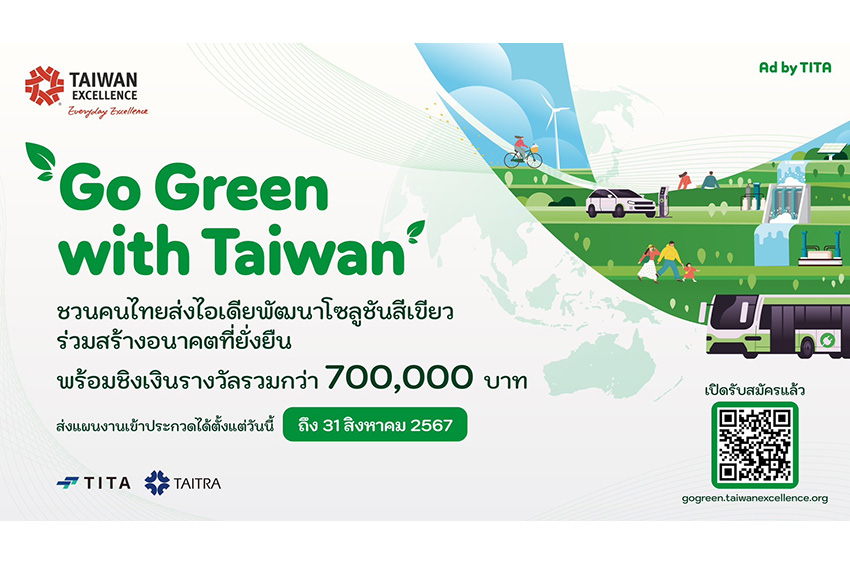 แคมเปญ “Go Green with Taiwan” จัดขึ้นโดยกรมการค้าระหว่างประเทศ (TITA) ภายใต้กระทรวงเศรษฐกิจ (MOEA) และดำเนินการโดยสภาส่งเสริมการค้าและการส่งออกไต้หวัน (TAITRA) ไต้หวันจึงขอเชิญชวนผู้ที่สนใจหรือใครที่มีไอเดียพัฒนาโซลูชันที่ยั่งยืน พร้อมจับมือกับไต้หวันเพื่อสร้างอนาคตที่เป็นมิตรกับสิ่งแวดล้อมและยั่งยืน สามารถส่งแผนและสมัครเข้าร่วมโครงการตั้งแต่วันนี้ – 31 สิงหาคมนี้ ดูรายละเอียดเกี่ยวกับการรับสมัครได้ที่เว็บไซต์ gogreen.taiwanexcellence.org หรือ gogreen.surveycake.biz/s/eLGWV และ เฟซบุ๊ก Taiwan Excellence TH