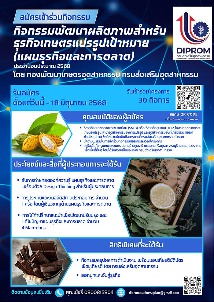 กองพัฒนาเกษตรอุตสาหกรรม กรมส่งเสริมอุตสาหกรรม ร่วมกับศูนย์บริการวิชาการแห่งจุฬาลงกรณ์มหาวิทยาลัย ขอเชิญผู้ประกอบการที่ทำธุรกิจในอุตสาหกรรมเกษตรแปรรูป อุตสาหกรรมอาหารแปรรูป อุตสาหกรรมอื่นที่เกี่ยวข้องตลอดห่วงโซ่อุปทาน สมัครเข้าร่วม "กิจกรรมพัฒนาผลิตภาพสำหรับธุรกิจเกษตรแปรรูปเป้าหมาย (แผนธุรกิจและการตลาด)" เพื่อพัฒนาและยกระดับผลิตภาพในการพัฒนาด้านแผนธุรกิจและการตลาด