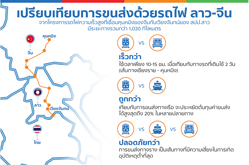 นายไพฑูรย์ จิรานันตรัตน์ กรรมการผู้จัดการ บริษัท เอสซีจี โลจิสติกส์ แมเนจเม้นท์ จำกัด กล่าวถึงความพร้อมของการขยายเส้นทางขนส่งทางราง ไทย-ลาว-จีน ว่า ปัจจุบันการค้าระหว่างไทย-จีน มีการเติบโตอย่างต่อเนื่อง โดยในปี 2564 ที่ผ่านมา มีมูลค่าการส่งออกจากไทยไปจีนกว่า 1.2 ล้านล้านบาท โดยเป็นการค้าผ่านแดนไทย-จีน มูลค่ารวม 366,970 ล้านบาท แบ่งเป็นการส่งออกมูลค่า 194,820 ล้านบาท และการนำเข้ามูลค่า 172,150 ล้านบาท ผ่านรูปแบบการขนส่งทั้งทางรถ เรือ และเครื่องบิน และจากโครงการรถไฟความเร็วสูงที่เชื่อมคุนหมิงของจีนกับเวียงจันทน์ของ สปป.ลาว เข้าด้วยกัน ซึ่งอยู่ภายใต้ยุทธศาสตร์ Belt and Road Initiative (BRI) ที่มีระยะทางรวมกว่า 1,020 กิโลเมตร เมื่อนำมาเปรียบเทียบกับการขนส่งทางรถด้วยเส้นทาง เชียงราย - คุนหมิงจะสามารถลดระยะเวลาในการขนส่งจากเดิมประมาณ 2 วัน เหลือเพียง 10-15 ชม. และเมื่อเทียบกับการขนส่งทางเรือ หรือ sea freight จะทำให้ประหยัดต้นทุนด้านโลจิสติกส์ได้สูงสุดถึง 20% ในหลายปลายทาง อาทิ คุนหมิง เฉิงตู ฉงชิ่ง เป็นต้น โดยการขนส่งทางราง ยังเป็นเส้นทางการขนส่งที่มีความเสี่ยงในการเกิดอุบัติเหตุต่ำที่สุดอีกด้วย ดังนั้นเส้นทางรถไฟสายนี้จะช่วยเพิ่มศักยภาพในการขนส่งและเพิ่มความสามารถในการแข่งขันให้กับผู้ประกอบการไทยได้เป็นอย่างดี