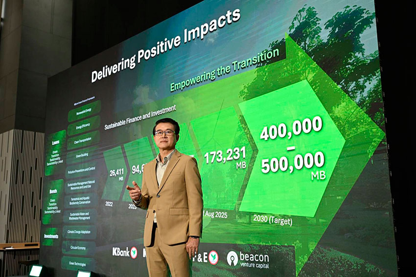 ธนาคารได้ปรับเป้าหมายสินเชื่อและเงินลงทุนเพื่อความยั่งยืน เป็น 4-5 แสนล้านบาท ภายในปี 2573 (ค.ศ.2030) เพื่อเร่งการเปลี่ยนผ่านสู่เศรษฐกิจคาร์บอนต่ำอย่างมีประสิทธิภาพ ตลอดจนมุ่งมั่นพัฒนา Beyond Banking Solution เพื่อส่งมอบ Climate Solution ที่จะช่วยเสริมสร้างศักยภาพให้แก่ลูกค้า และส่งเสริมการสร้าง Carbon Ecosystem ที่ครอบคลุมทุกมิติของการแก้ไขปัญหาสภาพภูมิอากาศ ได้แก่ การเป็นที่ปรึกษาด้านความยั่งยืนและการลดการปล่อยก๊าซเรือนกระจกสำหรับภาคธุรกิจที่ต้องการปรับตัว พร้อมพัฒนาเครื่องมือ KClimate1.5 สำหรับการจัดทำบัญชีก๊าซเรือนกระจก การจัดตั้ง Creative Climate Research Center เป็นศูนย์กลางองค์ความรู้และความร่วมมือเพื่อรับมือกับปัญหาโลกร้อน การริเริ่มโครงการต่างๆ เพื่อสร้าง Carbon Ecosystem ในสังคม เช่น Watt’s Up แพลตฟอร์มสำหรับรถมอเตอร์ไซค์ไฟฟ้า แพลตฟอร์ม Green Pass สำหรับการขอใบรับรอง RECs และแพลตฟอร์ม K-GreenSpace ที่ช่วยให้ลูกค้าเข้าถึงโซลูชัน Green Living ได้ง่ายขึ้น