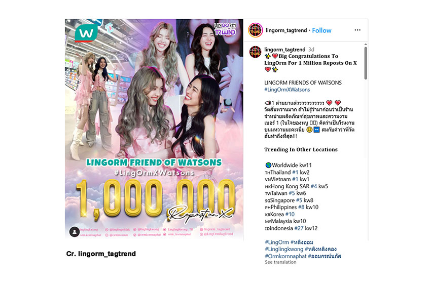 ด้วยพลังของชาวด้อมม่วง “เจ้าความรัก” ส่งผลให้กระแสตอบรับของงาน Friends of Watsons ทะลุทุกความคาดหมาย #LingOrmxWatsons ติดเทรนด์บนแพลตฟอร์ม x สูงถึง 1 ล้านครั้งภายใน 11 ชั่วโมง และพุ่งไปถึง 1.2 ล้านครั้งใน 24 ชั่วโมง โดยสร้างยอดตัวเลขการมีส่วนร่วม (Reach) ได้กว่า 29.7 ล้าน และมี Impression สูงถึง 372 ล้าน สะท้อนถึงอิทธิพลของแฟนด้อมที่เชื่อมโยงแบรนด์กับกลุ่มผู้บริโภคได้อย่างแน่นแฟ้น