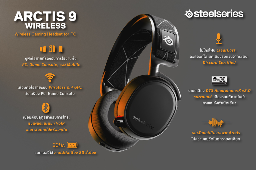 โดย Arctis 9 เป็นหูฟังเกมมิ่งไร้สายแบบครอบหูรุ่นใหม่ล่าสุดของตระกูล Artis ที่ถูกออกแบบมาให้สามารถใช้งานร่วมกับเกม PlayStation และ PC ได้อย่างเต็มประสิทธิภาพ ด้วยการเชื่อมต่อไร้สายแบบ Lossless 2.4 GHz Wireless เพื่อให้เหล่าเกมเมอร์เพลิดเพลินกับประสบการณ์ในการเล่นเกมได้อย่างสนุกสุดมันส์ โดยปราศจากการดีเลย์ ทั้งยังรองรับการเชื่อมต่อ Bluetooth โดยสามารถจับคู่กับมือถือเพื่อฟังเพลง แชท และรับสายโทรศัพท์ได้อย่างรวดเร็ว นอกจากนี้ ยังมาพร้อมไมโครโฟน ClearCast ที่รองรับการตัดเสียงรบกวนจาก Discord Certified รวมถึงระบบเสียง Surround และ DTS Headphone:X 2.0 ซึ่งจะช่วยให้เกมเมอร์ได้ยินเสียงในเกมที่แม่นยำ เป็นธรรมชาติและคมชัดทุกรายละเอียด ขณะเดียวกัน ตัวหูฟังยังออกแบบอย่างมีสไตล์ สวมใส่สบายพอดีกับศีรษะ ด้วยแถบคาดศีรษะเหล็กที่แข็งแรง พร้อมเสริมด้วยผ้ายืดหยุ่นได้แบบสายแว่นตาสกี (Ski Goggle Band) หูฟังหุ้มด้วยฟองน้ำและผ้าบุหูฟัง แบบ Airweave ที่ระบายอากาศได้ดี รวมถึงมีปุ่มคอนโทรล ChatMix อยู่บนหูฟังเพื่อให้นักเล่นเกมสามารถควบคุมการใช้เสียงสำหรับเกม หรือแชทได้ โดยไม่ต้องหยุดเล่นเกม พร้อมกับแบตเตอรี่แสนอึดที่สามารถรองรับการใช้งานได้ยาวนาน 20 ชั่วโมง โดยวางจำหน่ายในราคา 7,290 บาท