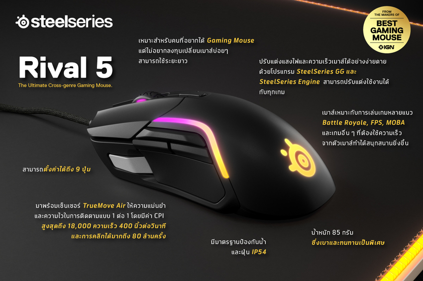 ขณะที่ Rival 5 เมาส์เกมมิ่งรุ่นใหม่ชนิดมีสาย ที่จะสร้างปรากฎการณ์ใหม่ให้กับวงการเมาส์ เพื่อมอบประสิทธิภาพสุดคุ้มในการเล่นเกมทุกแนวตั้งแต่ RPG, FPS จนถึง MOBA และ Battle Royales ได้สนุกสนานยิ่งขึ้น ตอบสนองไลฟ์สไตล์ และความต้องการคอเกมยุคใหม่ที่ต้องการเล่นเกมหลากหลายแนวมากขึ้น โดยจุดเด่นของ Rival 5 อยู่ที่การออกแบบอย่างล้ำสมัยเพื่อให้เกมเมอร์ สามารถปรับเปลี่ยนการใช้งานให้เหมาะกับเกมที่ต้องการเล่นได้รวดเร็ว แตกต่างจากเมาส์ทั่วไปที่ออกแบบมาเฉพาะสำหรับเกมที่เล่นหลากหลายชนิด พร้อมกับน้ำหนักที่ค่อนข้างเบาเพียง 85 กรัม และสายเคเบิล Super Mesh ทำให้มีความคล่องตัวในการขยับและใช้งานได้รวดเร็ว นอกจากนี้ ยังดีไซน์ตามหลักสรีระของอุ้งมือ ทำให้สามารถใช้งานได้เป็นเวลานานๆ โดยไม่เมื่อยมือ แถมยังจับถนัดมือทุกรูปแบบ รวมถึงมีปุ่มควบคุมที่สามารถตั้งค่าคำสั่งลัดได้ถึง 9 ปุ่ม พร้อมปุ่มแบบ Toggle ที่ตอบสนองการสั่งงานได้อย่างรวดเร็ว และฟังก์ชั่นการปรับแต่งแสงไฟแบบ RGB ได้ 10 จุด 16.8 ล้านสีที่ทั้งสวยและคมชัด เพื่อให้เหมาะสมกับเกมที่ต้องการเล่นได้ ยิ่งไปกว่านั้น ยังมาพร้อมเซ็นเซอร์ TrueMove Air ซึ่งให้ความแม่นยำและความไวในการติดตามแบบ 1 ต่อ 1 โดยมีค่า CPI สูงสุดถึง 18,000 ความเร็ว 400 นิ้วต่อวินาที (IPS) ทำให้การเล่นเกมลื่นไหลไม่มีสะดุด รวมถึงสวิทซ์ที่มีความทนทานรองรับการคลิกได้มากถึง 80 ล้านครั้ง ซึ่งมีความทนทานมากกว่าเมาส์เกมมิ่งทั่วไปถึง 3 เท่า ทั้งยังป้องกันน้ำและฝุ่น IP54 โดยวางจำหน่ายในราคา 2,690 บาท