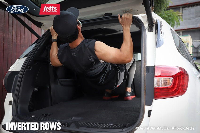 อีกหนึ่งท่าที่ช่วยยกระดับการออกกำลังกายที่บ้านให้เข้มข้นยิ่งขึ้นได้แม้ไม่มีอุปกรณ์บาร์ครบครันแบบในฟิตเนส ก็ยังสามารถใช้รถฟอร์ด เอเวอเรสต์ คู่ใจเสริมท่าดึงข้อแบบ Inverted Rows เพื่อสร้างความแข็งแกร่งให้แก่กล้ามเนื้อหลายส่วน ไม่ว่าจะเป็นกล้ามแขนอย่าง Biceps และกล้ามหลัง เพียงกดปุ่มพับเบาะแถวที่สามลงให้แบนราบด้วยระบบไฟฟ้า ซึ่งเพิ่มพื้นที่บรรทุกสัมภาระได้มากถึง 2,010 ลิตร จากนั้นนั่งเข้าไปบริเวณที่เก็บสัมภาระและจับขอบหลังคารถไว้ให้มั่น ให้สองมือกว้างกว่าไหล่เล็กน้อย จากนั้นจึงงอแขน ออกแรงดึงลำตัวและขาขึ้นจนหน้าอกชิดกับหลังคารถ แล้วจึงเหยียดแขนและลดลำตัวลงโดยไม่ให้หลังสัมผัสกับพื้นรถ ทำซ้ำเซ็ทละ 10-15 ครั้ง รวม 3-4 เซ็ท และสำหรับฟอร์ด เอเวอเรสต์ อำนวยความสะดวกในท่านี้ยิ่งขึ้นด้วยระบบประตูไฟฟ้าแบบแฮนด์ฟรีที่ทำงานร่วมกับกุญแจรีโมทอัจฉริยะ เพียงมีกุญแจในกระเป๋าและยื่นเท้าไปที่ใต้กันชนท้าย ประตูท้ายรถก็จะเปิดขึ้นอัตโนมัติ