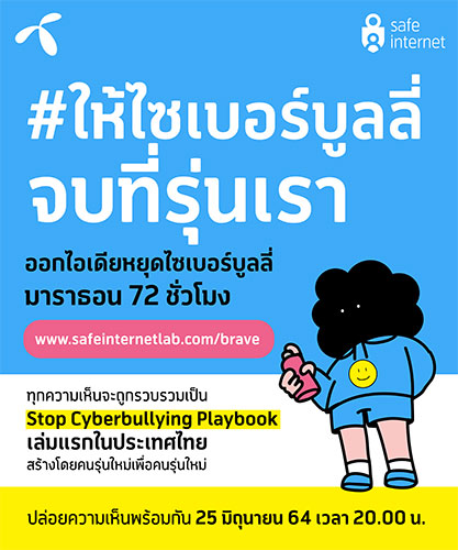 ทั้งนี้ ขอเชิญน้องๆ เยาวชน หน่วยงานและองค์กรที่มีความสนใจในการแก้ไขปัญหาการกลั่นแกล้งทางออนไลน์ ร่วมระดมความเห็นได้ตั้งแต่วันที่ 25 มิถุนายน เวลา 20.00 น. ถึงวันที่ 28 มิถุนายน เวลา 20.00 น. ได้ที่ www.safeinternetlab.com/brave