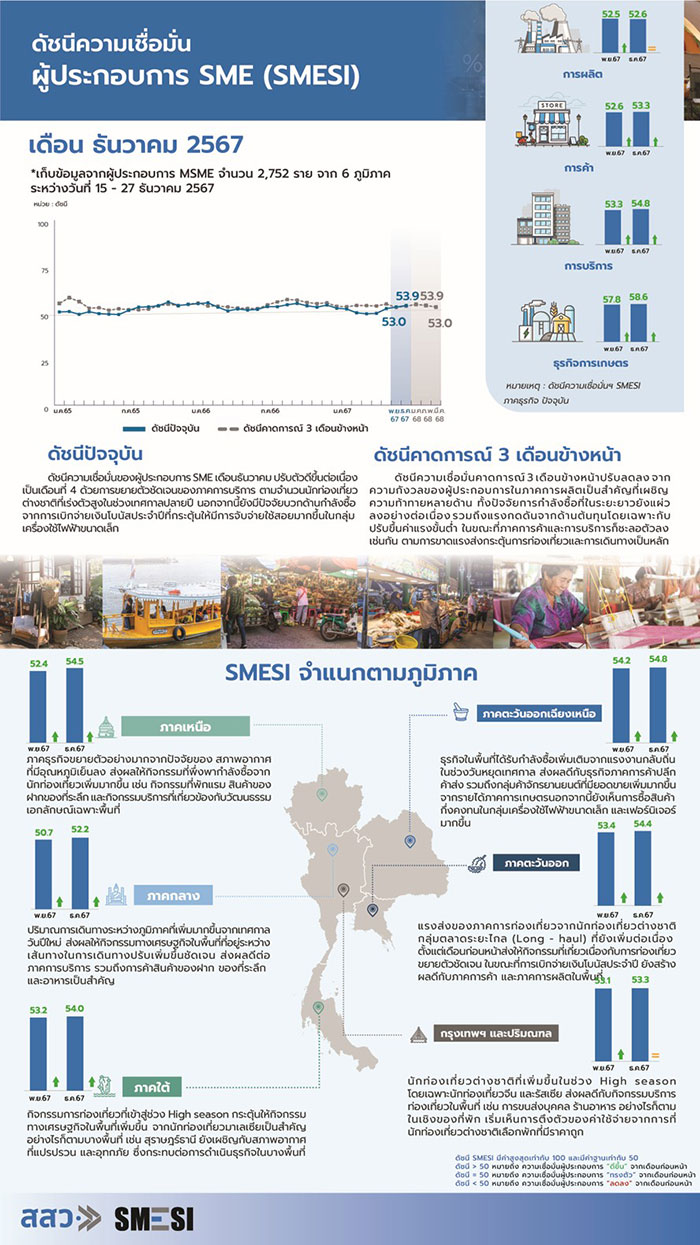 นางสาวปณิตา ชินวัตร รองผู้อำนวยการสำนักงานส่งเสริมวิสาหกิจขนาดกลางและขนาดย่อม รักษาการแทนผู้อำนวยการสำนักงานส่งเสริมวิสาหกิจขนาดกลางและขนาดย่อม (สสว.) เปิดเผยดัชนี SMESI ประจำเดือนธันวาคม 2567 อยู่ที่ระดับ 53.9 จากระดับ 53.0 ของเดือนก่อนหน้า และปรับตัวเพิ่มขึ้นต่อเนื่องเป็นเดือนที่ 4 มีปัจจัยบวกจากการขยายตัวอย่างชัดเจนของภาคการบริการ ตามแรงส่งของกิจกรรมทางเศรษฐกิจที่เพิ่มขึ้นตามจำนวนนักท่องเที่ยวต่างชาติที่เร่งตัวสูงในช่วงเทศกาลปลายปี นอกจากนี้ยังมีปัจจัยบวกด้านกำลังซื้อจากการเบิกจ่ายเงินโบนัสประจำปีของภาคเอกชนที่กระตุ้นให้มีการจับจ่ายใช้สอยมากขึ้นในกลุ่มเครื่องใช้ไฟฟ้าขนาดเล็ก รวมถึงสินค้าอิเล็กทรอนิกส์เป็นหลัก อย่างไรก็ตามภาคการผลิตมีแนวโน้มทรงตัว ตามการปรับลดกำลังการผลิตอย่างต่อเนื่อง รวมถึงการลดกำลังการผลิตตามจำนวนวันหยุดในช่วงสิ้นปี เมื่อพิจารณาองค์ประกอบของดัชนี พบว่า ปรับตัวเพิ่มขึ้นในทุกองค์ประกอบ มีสาเหตุมาจากกิจกรรมทางเศรษฐกิจทั้งด้านการท่องเที่ยว การจับจ่ายใช้สอยสินค้าอุปโภคบริโภค โดยองค์ประกอบด้านคำสั่งซื้อโดยรวม ปรับเพิ่มขึ้นจากระดับ 62.0 เป็นระดับ 63.3 องค์ประกอบด้านปริมาณการผลิต/การค้า/บริการ ปรับตัวเพิ่มขึ้นจากระดับ 58.1 เป็นระดับ 58.5 องค์ประกอบด้านการลงทุนโดยรวม ปรับตัวเพิ่มขึ้นสูงสุดจากระดับ 50.6 เป็นระดับ 52.2 องค์ประกอบด้านต้นทุนรวม (ต่อหน่วย) ปรับเพิ่มขึ้นจากระดับ 39.2 เป็นระดับ 39.8 องค์ประกอบด้านกำไรปรับตัวเพิ่มขึ้นจาก 58.0 เป็นระดับ 59.4 และองค์ประกอบด้านการจ้างงานปรับตัวเพิ่มขึ้นเล็กน้อยจากระดับ 50.2 เป็นระดับ 50.3