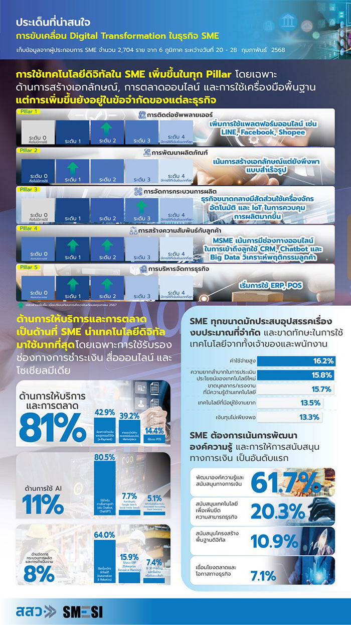 สสว. เผยผลสำรวจการขับเคลื่อน Digital ของ SME ไทย ประจำปี 2568 พบว่า เริ่มมีการเข้าถึงและใช้เทคโนโลยีดิจิทัลเพิ่มขึ้น เช่น แพลตฟอร์มออนไลน์ Social Media โปรแกรมบริหารจัดการธุรกิจ ฯลฯ กว่า 80% ใช้ในด้านการให้บริการและการตลาด แต่ยังมีข้อจำกัดด้านงบประมาณ ความยุ่งยากในการใช้งาน และทักษะของบุคลากร ขณะที่ภาครัฐควรมุ่งส่งเสริมโดยเน้นการเพิ่มองค์ความรู้และการสนับสนุนทางการเงิน เพื่อช่วยเพิ่มศักยภาพทางธุรกิจให้กับ SME